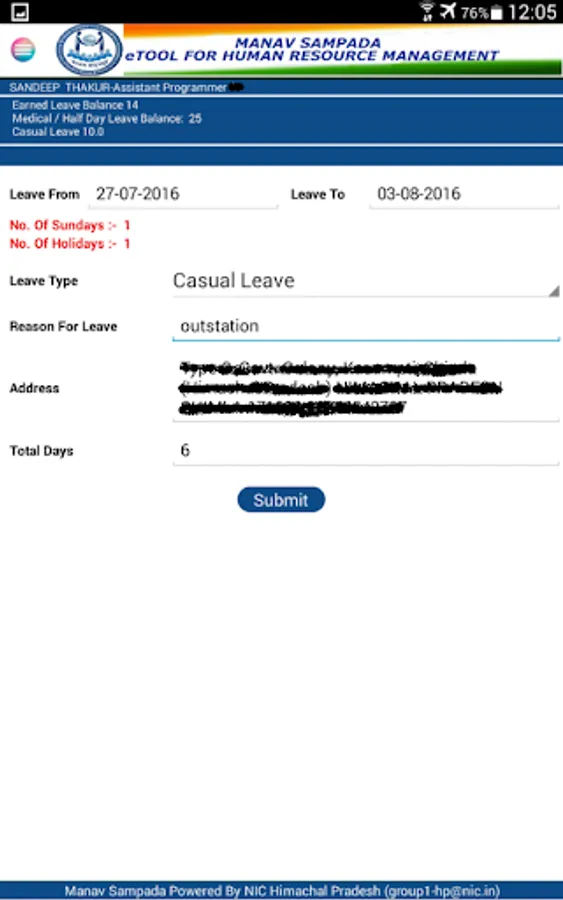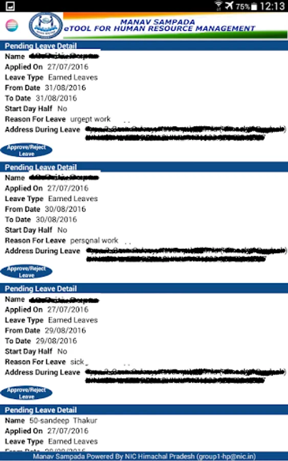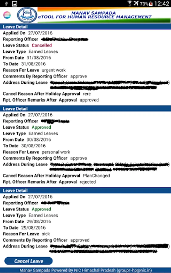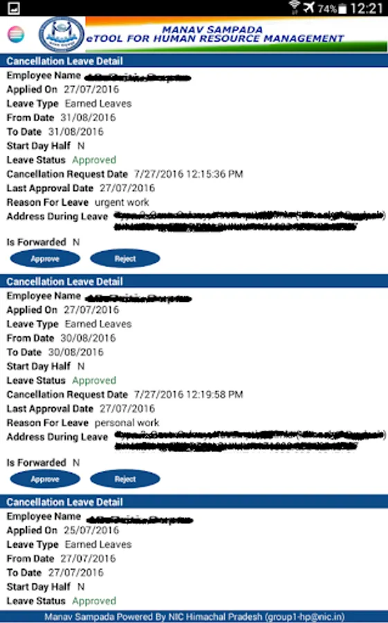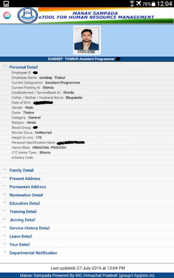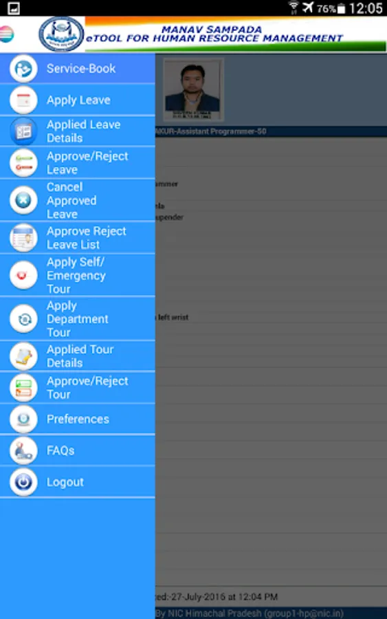 The Manav Sampada App enables the employees of any State Government in India, who are using the Manav Sampada (Personnel MIS) software, to view their eService book (information related to employee, education, family, training, joining, leave, tour, salary service history etc). The employees can also view the balance of various types of leave on the Mobile app and can submit application for leave or tour approval. The employees can also delete leave (till it is pending) & cancel their approved leave. The reporting officers can view the leaves applied by their subordinates and may approve/ reject these leave applications. The tour requests are dealt in a similar manner.