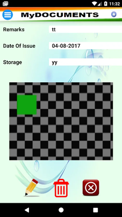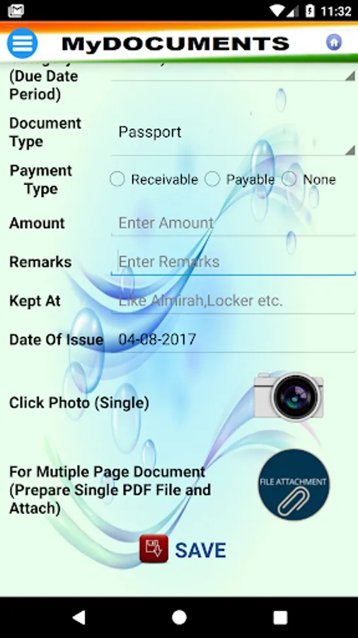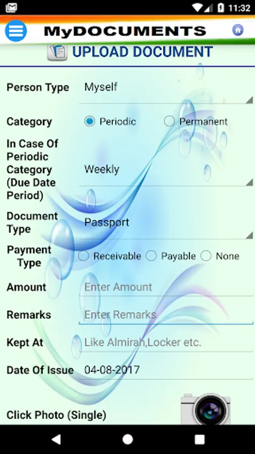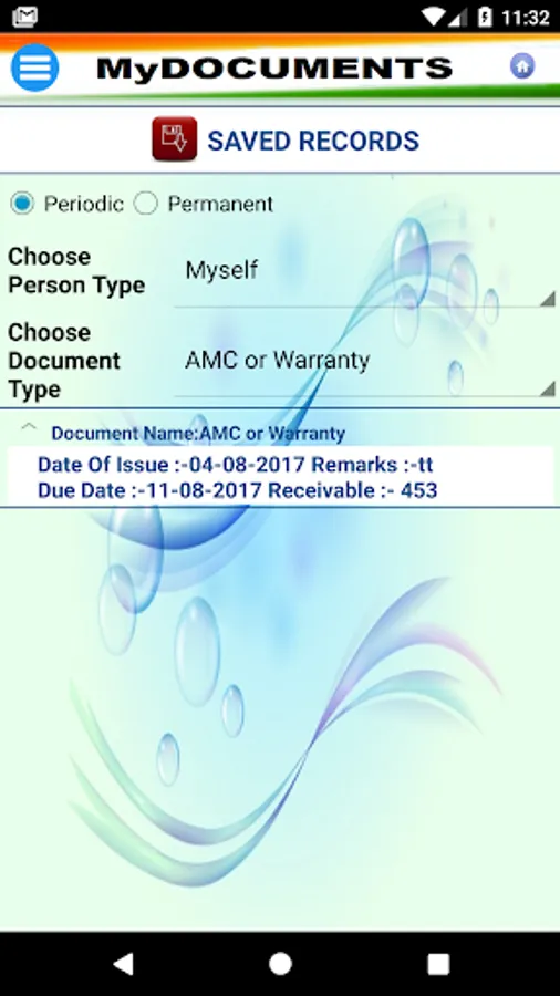 MyDocuments app is an effort to ease the task of keeping a scanned copy of all important documents electronically. The effort is made to enable user to get alerts for all periodic documents which may need renewal or any other important activity at a known periodicity or a known date. User can store monthly utility bill copy and can set periodicity monthly to raise the alerts well in time. Even the time can also be defined by the user him/herself. The important documents like Arm License, Driving License, Passport, Registered Deeds, RDs, FDs, Degrees, Certificates etc. can also be scanned and stored.