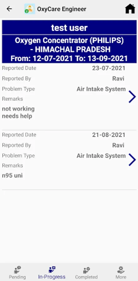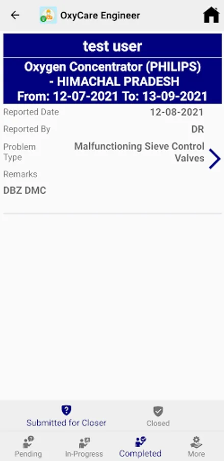 A feature to report any problem being encountered related to these equipments is already available in the OxyCare mobile app. The Health Facilities will report the problem using this feature. The MIS reports are available on the portal to monitor these complaints. OxyCare Engineer mobile app has been developed with an objective to make these complaints visible to the concerned Engineer who will further add the action taken report using this app. The app allows Engineer to add interim or final action and submit for disposal. The final disposal of the complaint which are submitted for disposal is carried out by the Health Facility in-charge using the OxyCare mobile app.