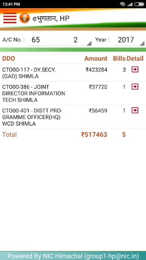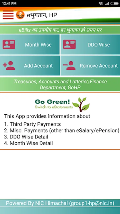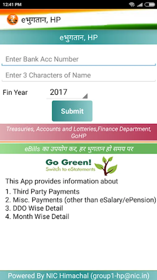 The eBhugtan App provides the details of electronic payments made to employees/pensioners/others (like contractors/vendors). Based on the account number, this app provide information about electronic payments made by the Government of Himachal Pradesh through treasuries. The user can view DDO Wise bill details as well as Month Wise Bill Details.