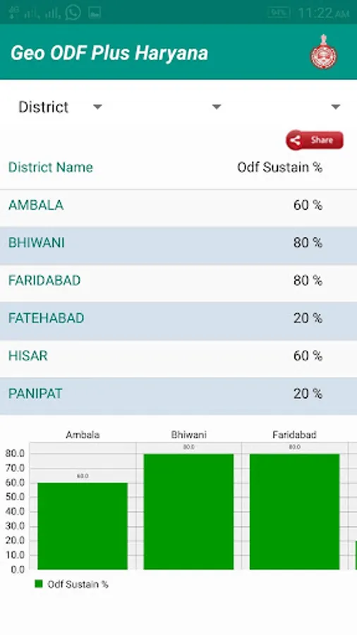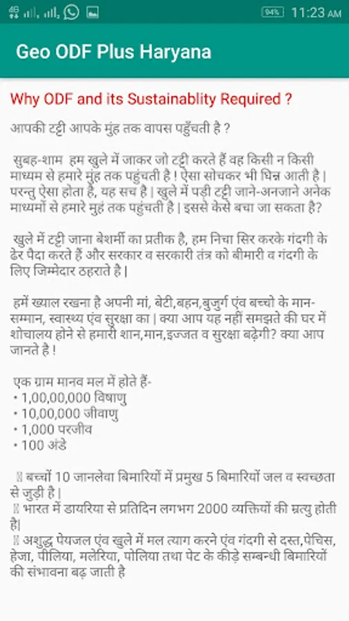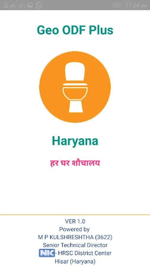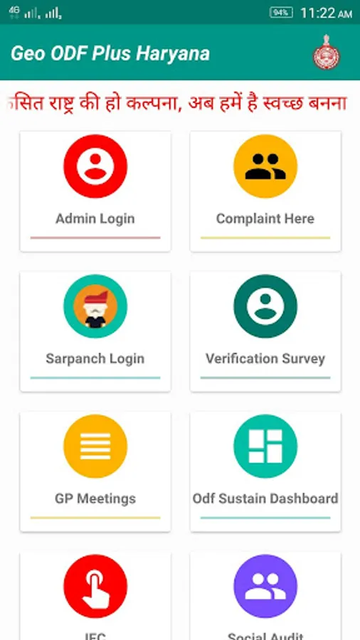 The mobile application, "Geo ODF Plus Haryana" is a mobile application for monitoring sanitary facility. It has different modules like admin login, complaint box, sarpanch login, survey, meetings, sustain dashboard, IEC & social audit.