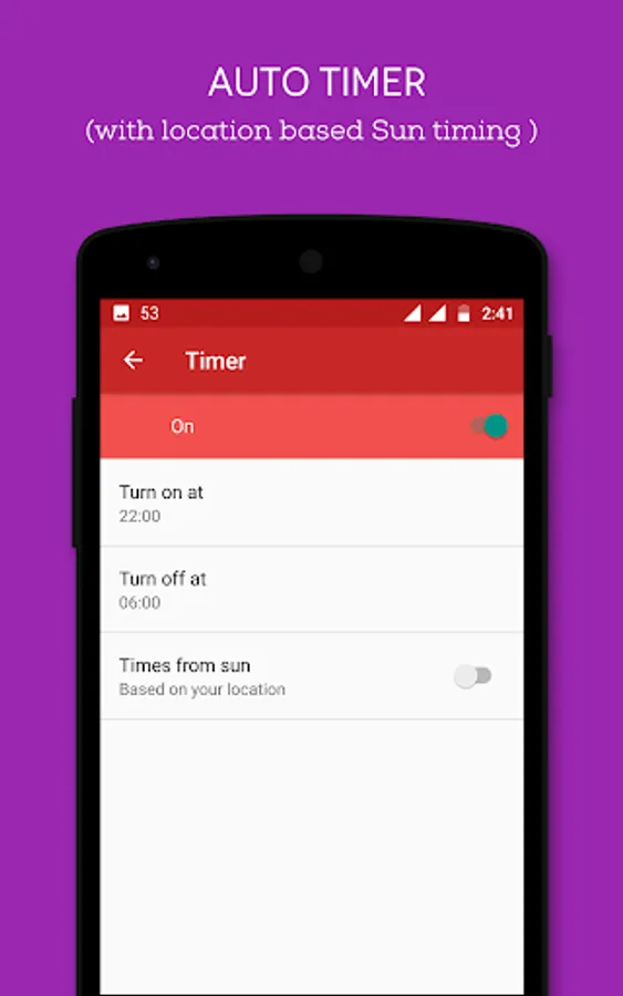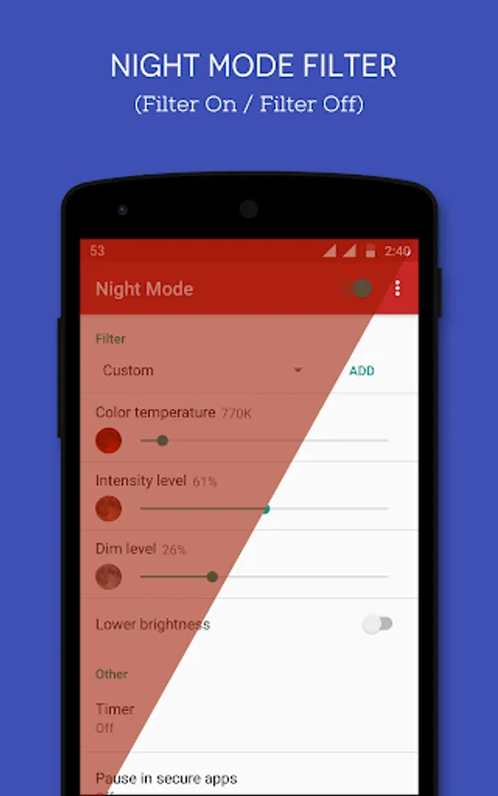 Night mode app makes your device screen adapt to the day light time and It filters the flux of blue light emitted by your smart devices after sunset and protects your eyes with a soft and pleasant red filter.