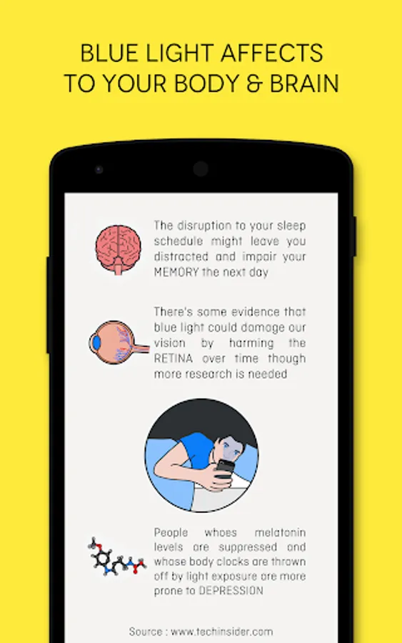 Recent research has proven that exposure to blue light before sleep may distort your natural (circadian) rhythm and cause inability to fall asleep, that ultimately leads to serious health issues. This app is here for your trouble less reading at night.