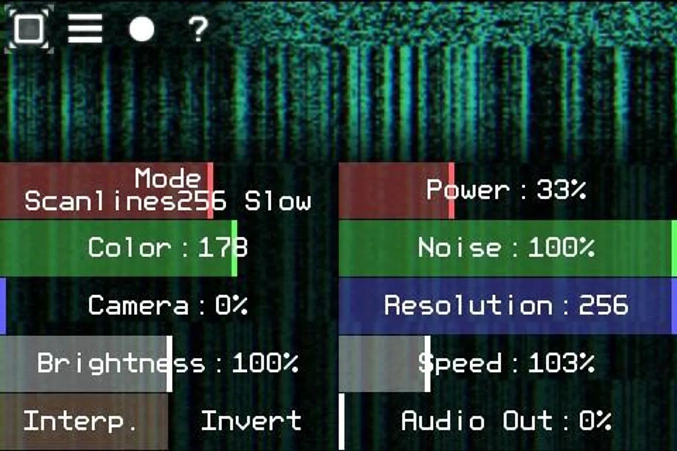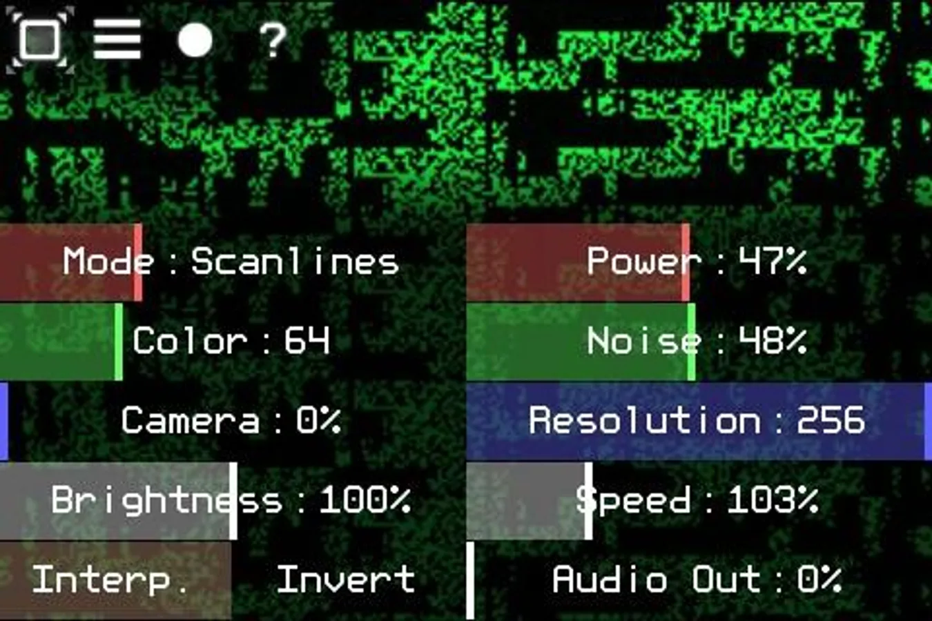Quantum VJ HD is a simple glitch-style audio visualizer. It can receive sound from the microphone or from the Line-in port (depends on the system settings). Sound will be converted to the graphic elements byte by byte. The final video can be mixed with the camera stream in real time.