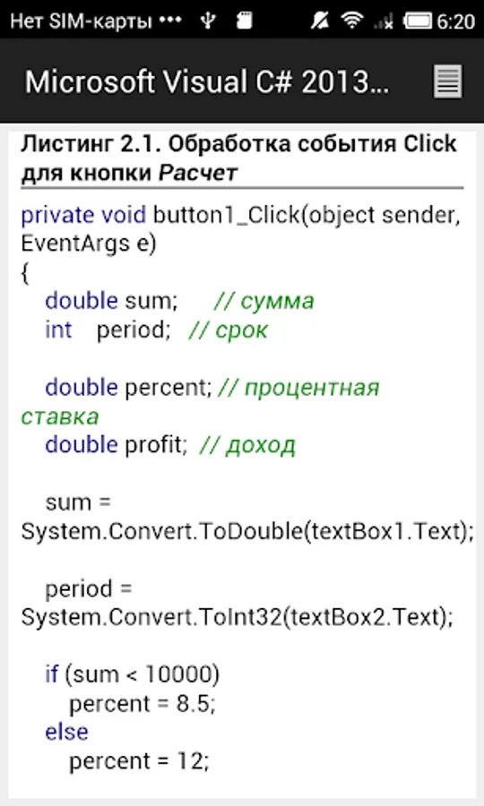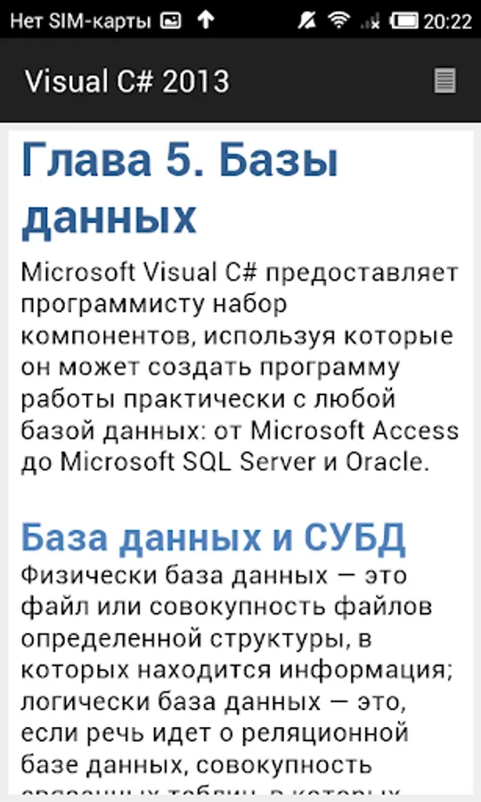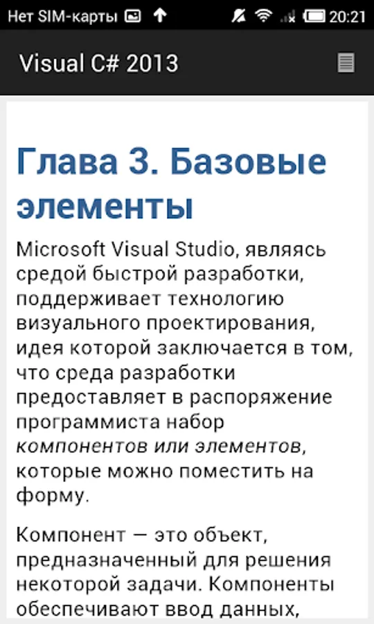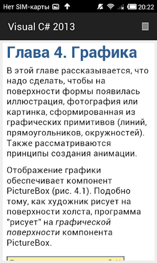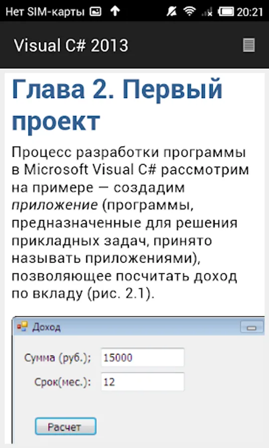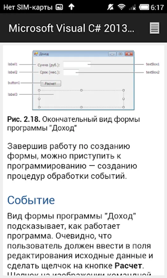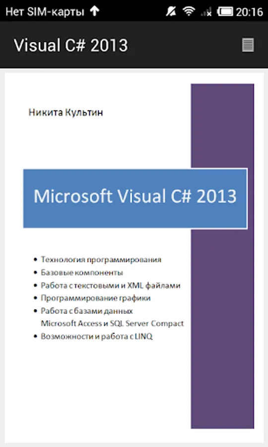 The second part of the book is devoted to the practice. It examines the problem of graphics programming, databases (Microsoft Access and Microsoft SQL Compact Edition), the use of technology LINQ to work with arrays and XML documents, the attention paid to the problem of deployment (installation) applications on the user's computer.