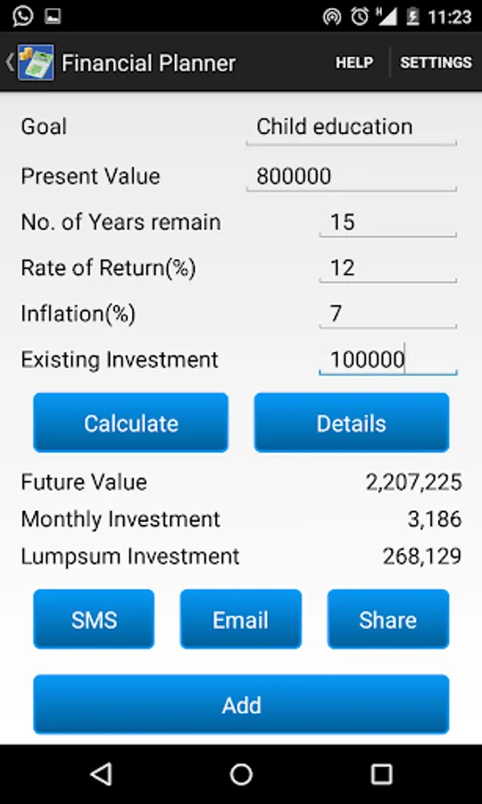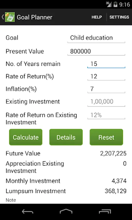 Example: Suppose you want to plan for your Child education which costs 8, 00,000 today. The Number of Years remain is 15 years and the inflation you expect is 7% and you expect 12% return from your investments. In that case future value is 22, 07,225 and to achieve that future value you need to invest 4,418 per month or lump sum investment of 4, 03,252 today to achieve the future value.