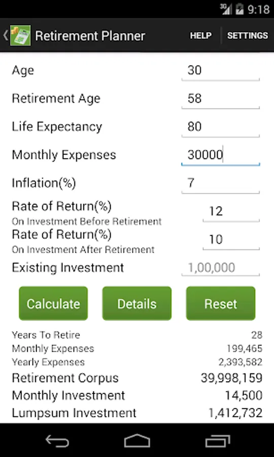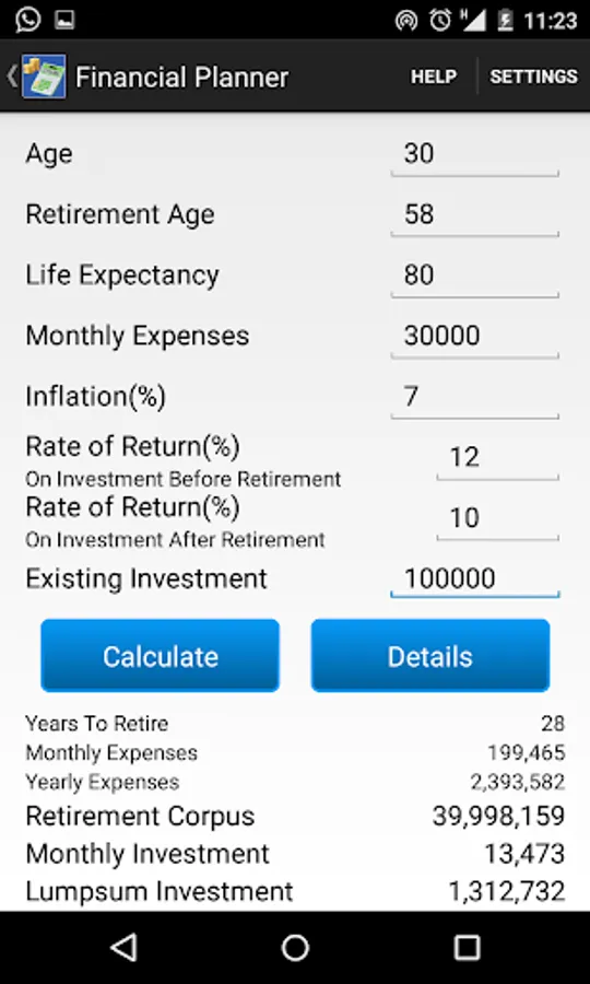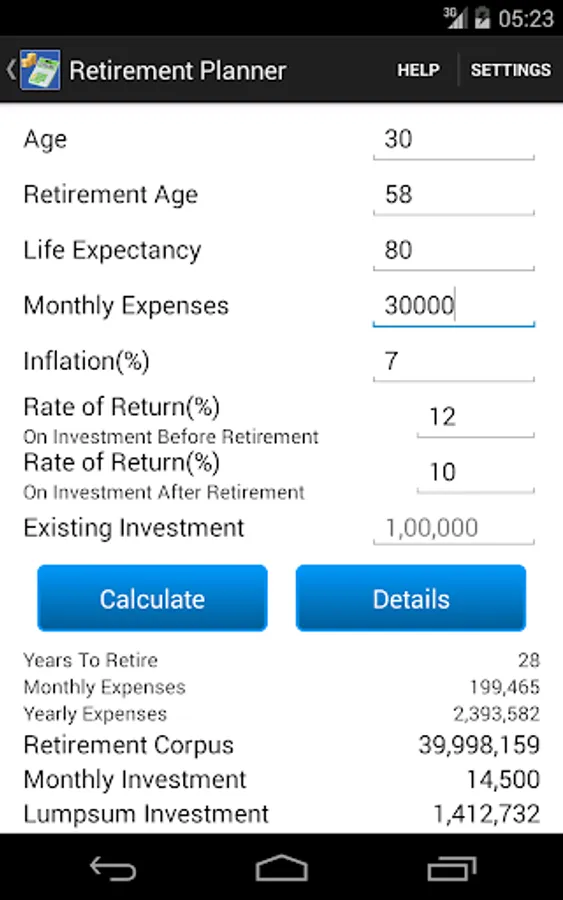 Retirement Planner helps you determine how much money you will need for your retirement to maintain the current lifestyle post retirement. You can give the Current Age, Retirement Age, Current Monthly Expenses, and Expected Inflation, rate of returns on your investments before retirement and rate of returns on your investments after retirement.