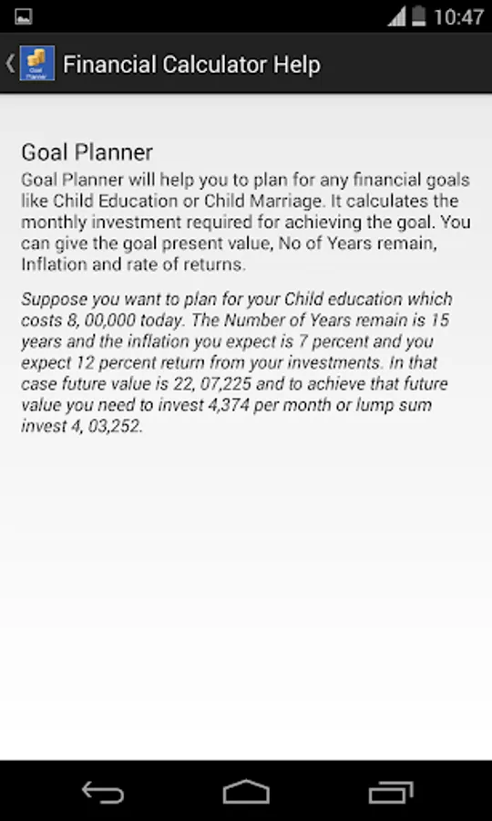 Goal Planner will help you to plan for any financial goals like Child Education or Child Marriage, Buying a vehicle or a property, House Renovation, Start a business or Vacation. It calculates the monthly investment required for achieving the goal. You can give the goal present value, No of Years remain, Inflation (%) and rate of returns (%) on your investments.