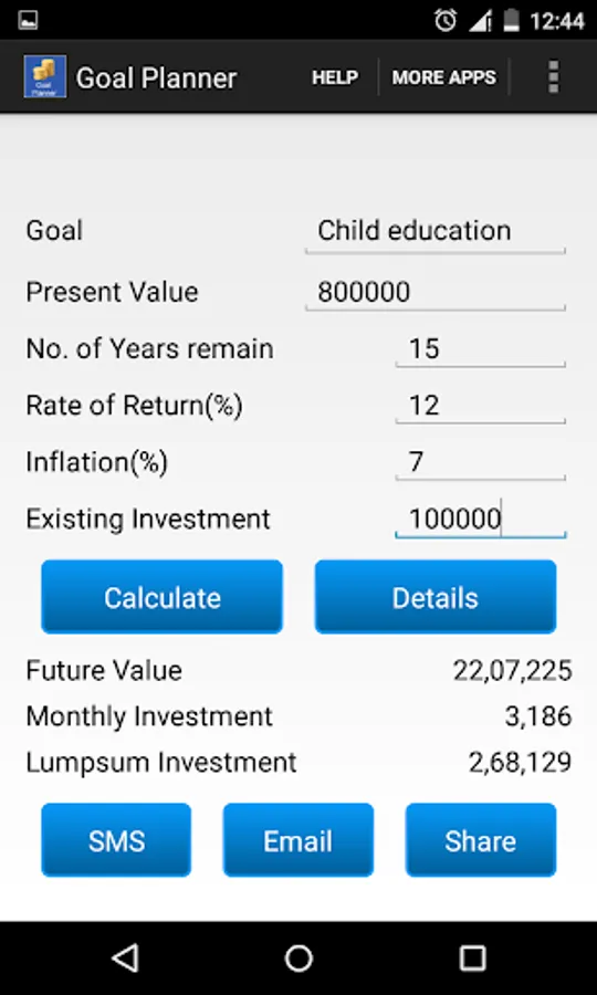 Suppose you want to plan for your Child education which costs 800,000 today. The Number of Years remain is 15 years and the inflation you expect is 7% and you expect 12% return from your investments. In that case future value is 2,207,225 and to achieve that future value you need to invest 4,374 per month or lump sum invest 368,129.