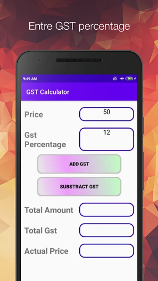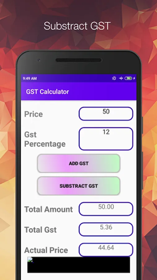 User can easily calculate CGST (Central goods and service tax), SGST (State goods and service tax) and IGST (Integrated goods and service tax) for any given amount. User can also easily share GST as well as other calculations from history view. This GST calculator predefined GST rates (3%, 5%, 12%, 18% and 28%) as per Indian tax slabs, but user can also customize them as per requirements inside settings.