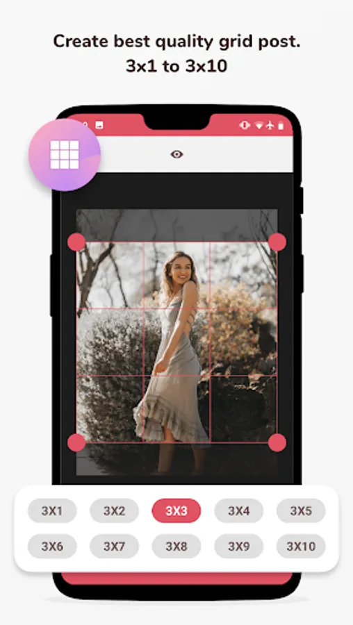 • Create attractive grids by cropping any photo into 3×1, 3×2, 3×3, 3x4, 3x5, 3x6, 3x7, 3x8, 3x9, 3x10 grids.