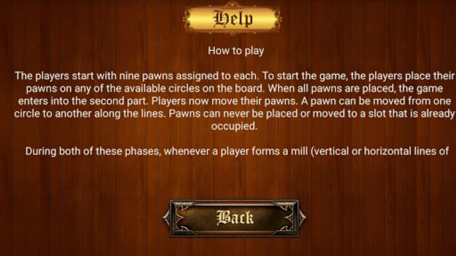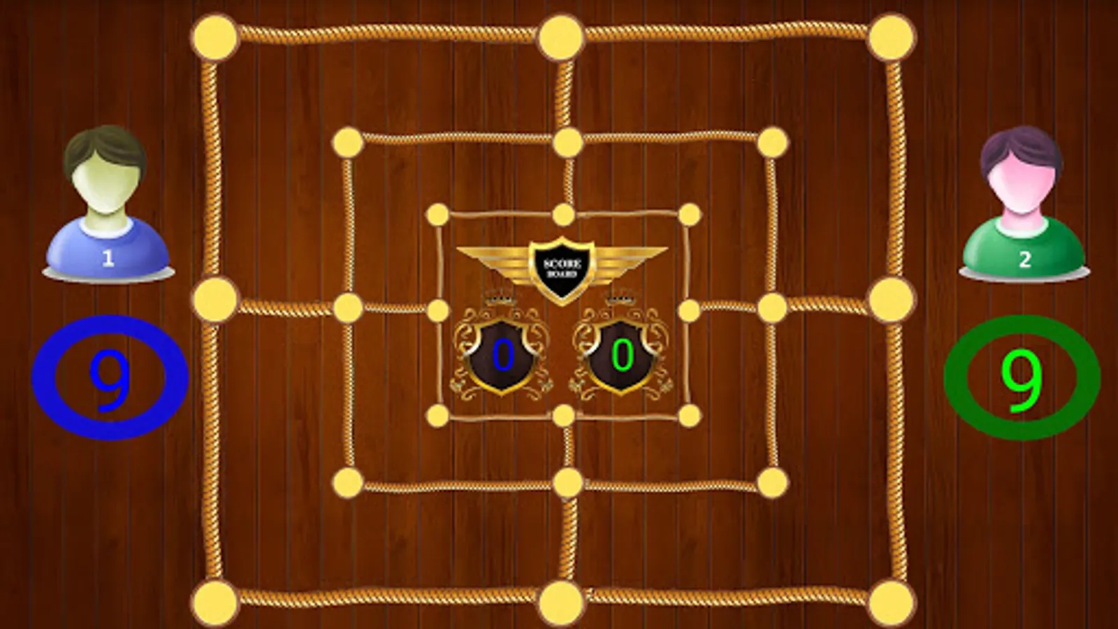 The players start with nine pawns assigned to each. To start the game, the players place their pawns on any of the available circles on the board. When all pawns are placed, the game enters into the second part. Players now move their pawns. A pawn can be moved from one circle to another along the lines. Pawns can never be placed or moved to a slot that is already occupied.