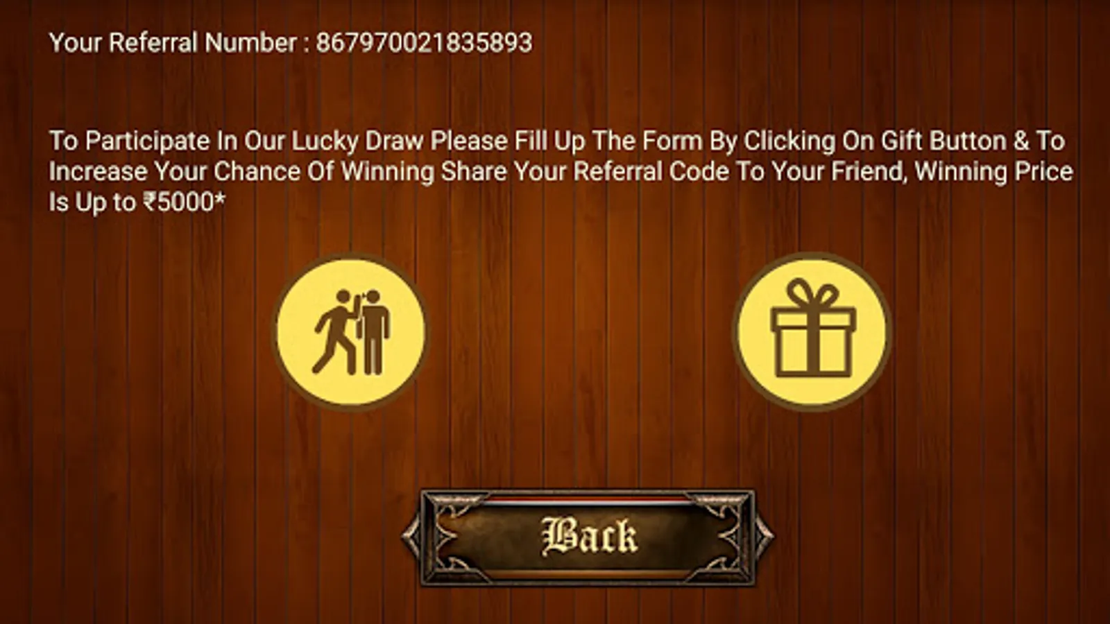 You can also have a chance to win ₹5000* for that you just need to participate in our lucky draw by installing the game on your device after that click on options menu now click on gift icon and you get one referral number now fill up one form by clicking on another gift icon in that panel.