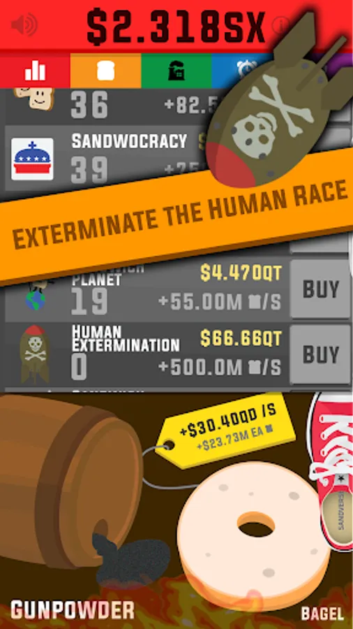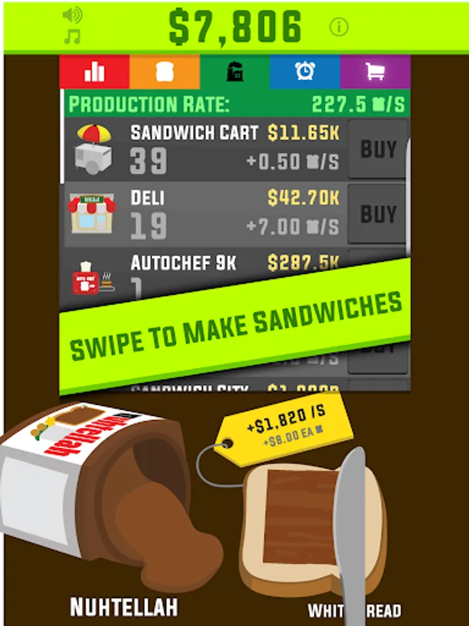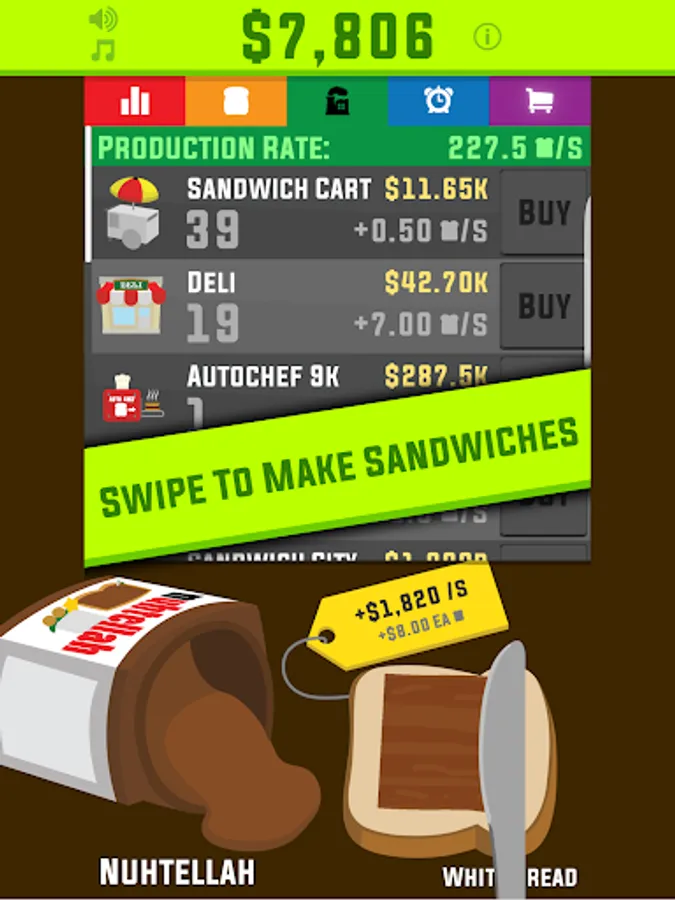 Swipe to make sandwiches. Sell them for money. Hire others to make Sandwiches. Discover the truth. Bring Humanity to its knees. Rule the world. Rule the galaxy. Rule the universe. All Hail.