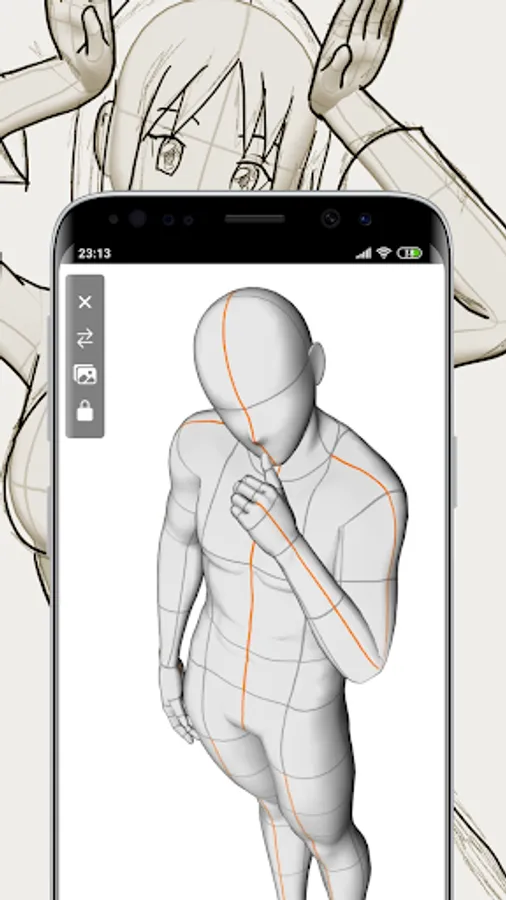 Find the pose you imagine in our poses gallery, perfectly organized for easy navigation. Each pose has more than one camera angle to choose from, select one and modify the size and orientation with your fingers. Lock the screen so the image doesn't move and use it as a reference to draw.