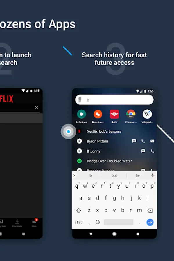 • Fast Search that's designed to work in 1 or 2 taps. It matches the first letters of words. Typing “S” “B” will bring “Spotify: The Beatles” to the top. Since it learns from you, next time just “S” will do