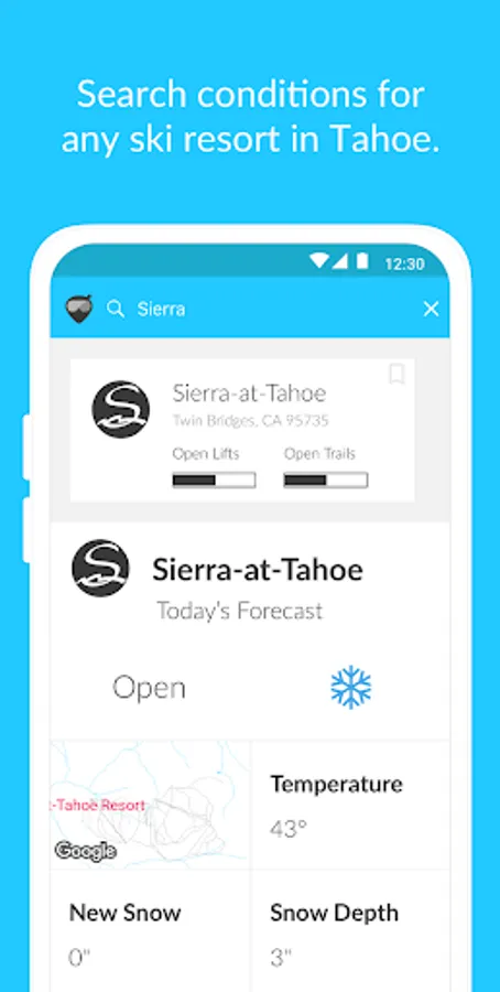 Find snow updates, chain control and road conditions for ski areas in Tahoe. Everything you want to know before you hit the slopes is available a single tap away.