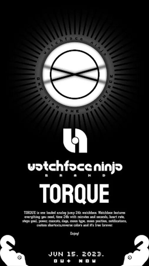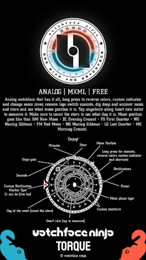 TORQUE is one loaded analog jump 24h watchface. Watchface features everything you need, time 24h with minutes and seconds, heart rate, steps goal, power, mascots, days, moon type, moon position, notifications, custom shortcuts,reverse colors and it's free forever.