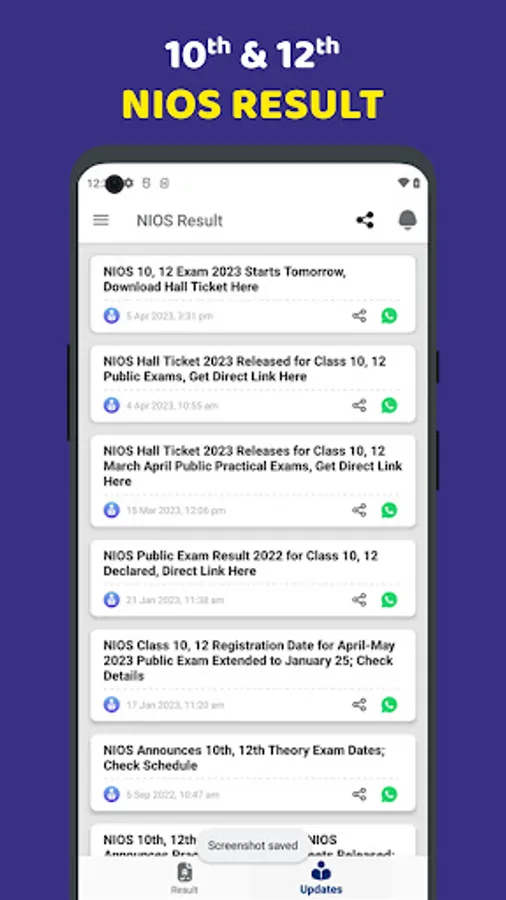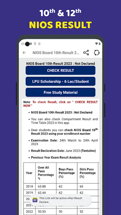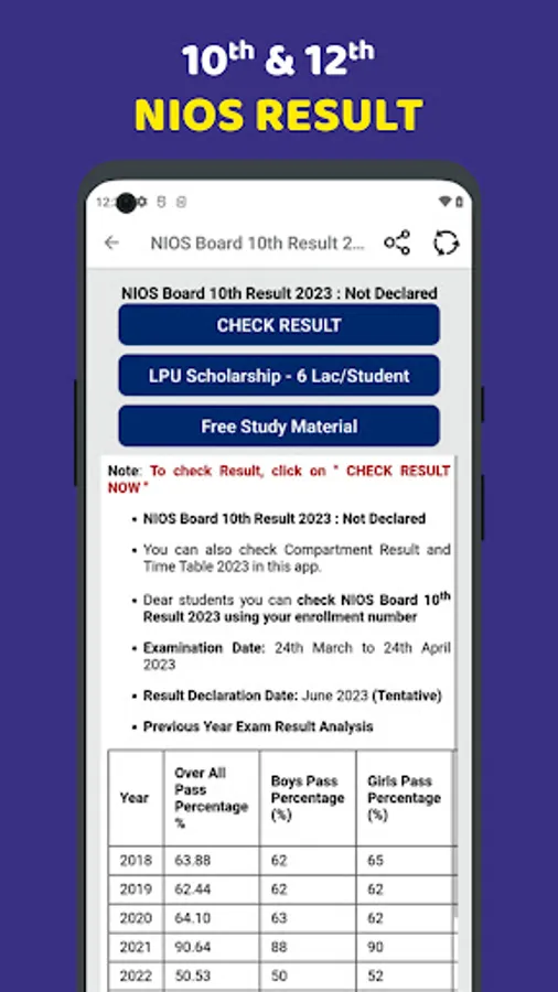 - Real-time Results: get instant updates as soon as the NIOS 10th & 12th results are announced. Say goodbye to waiting and hello to timely information.