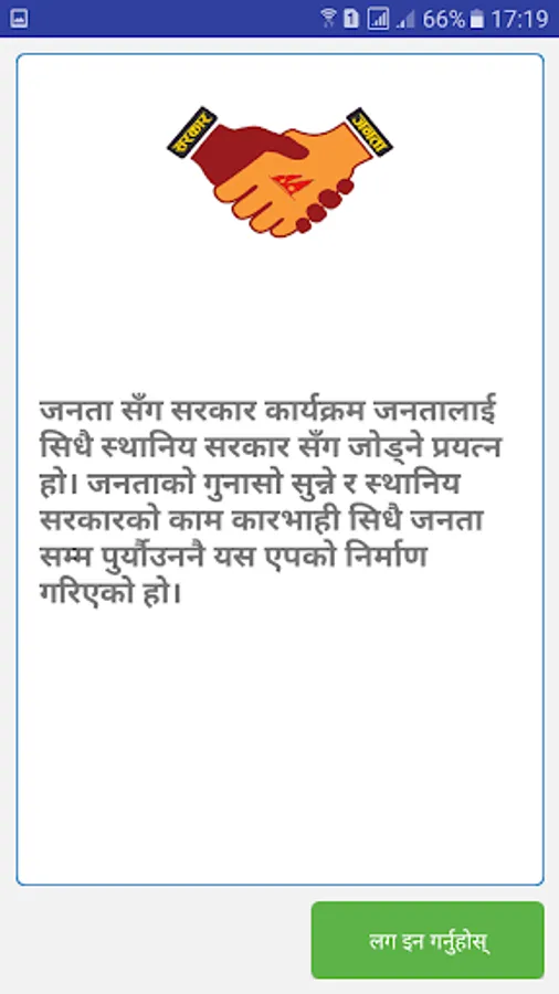 जनता सँग सरकार कार्यक्रम जनतालाई सिधै स्थानिय सरकार सँग जोड्ने प्रयत्न हो। जनताको गुनासो सुन्ने र स्थानिय सरकारको काम कारभाही सिधै जनता सम्म पुर्यौउननै यस एपको निर्माण गरिएको हो।