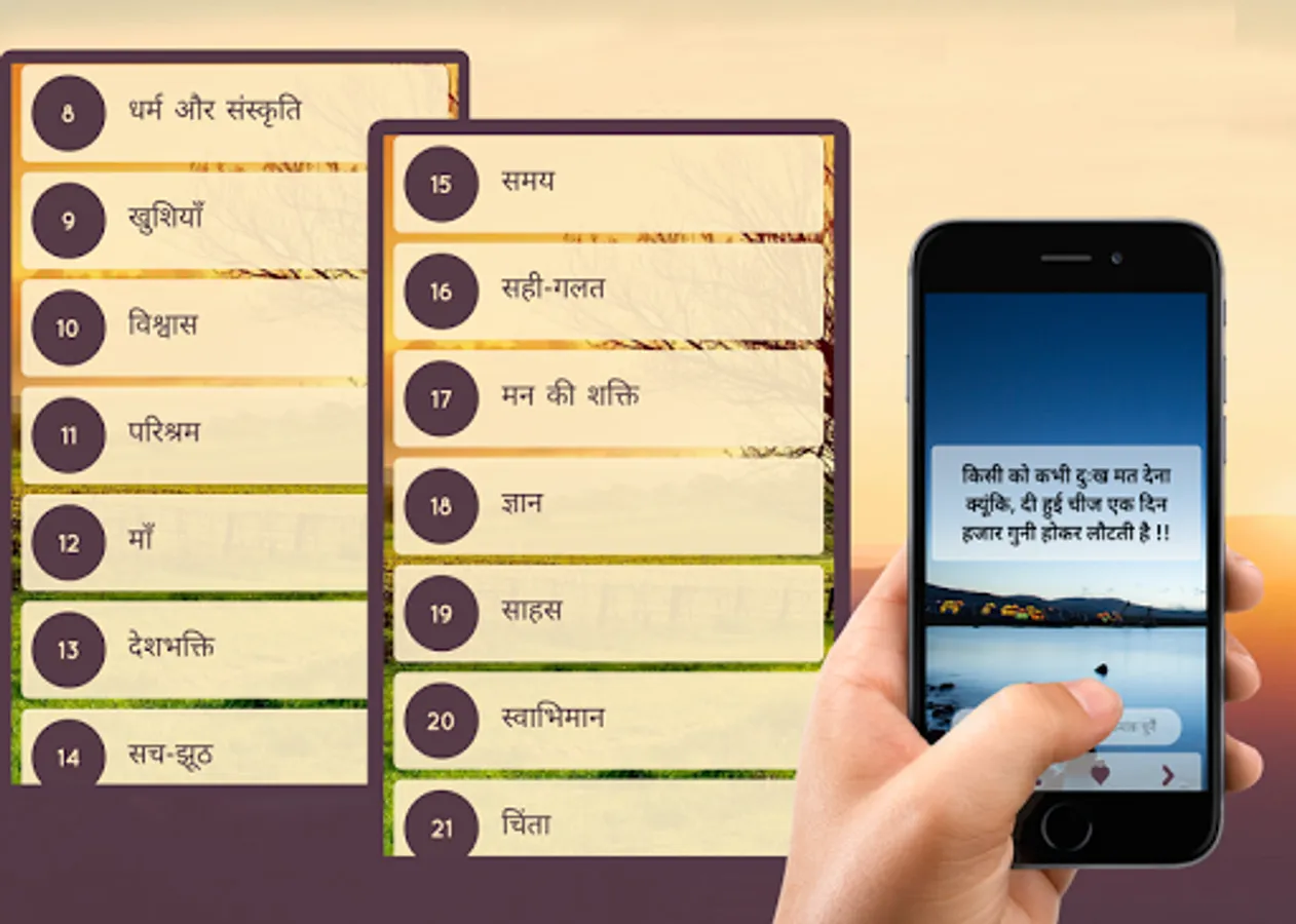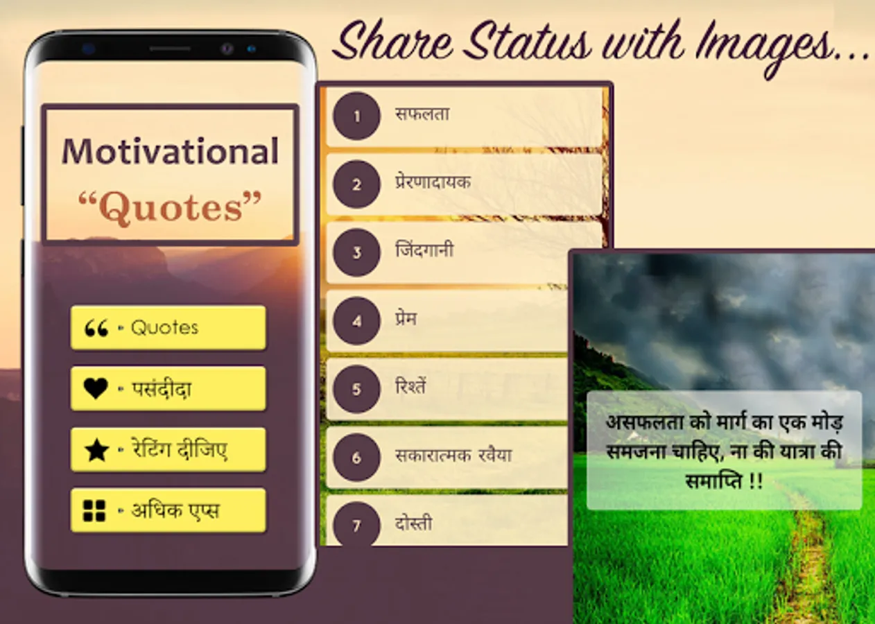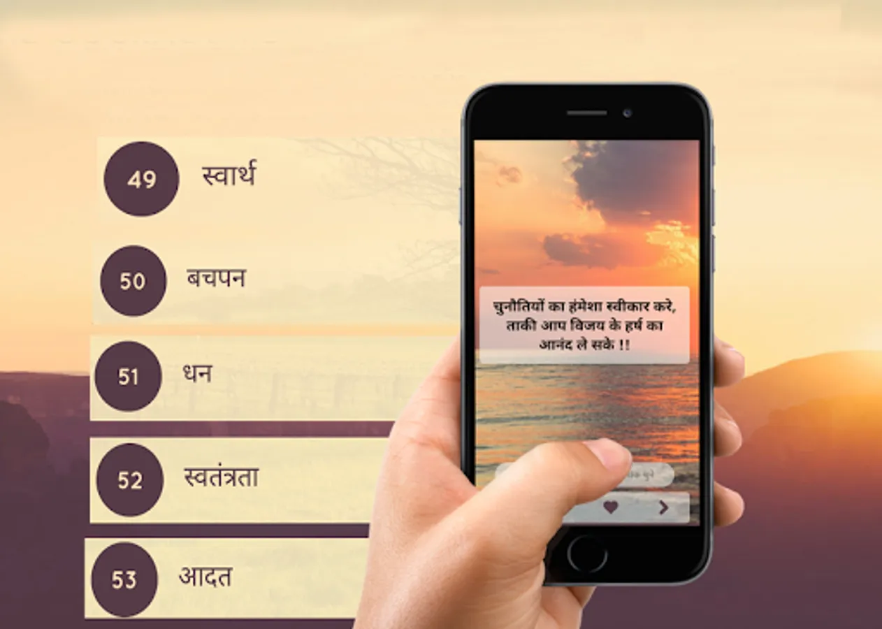 This application present large and best collection of motivational quotes in Hindi Language.Be motivated, and motivate others by reading and sharing motivational and inspirational quotes.