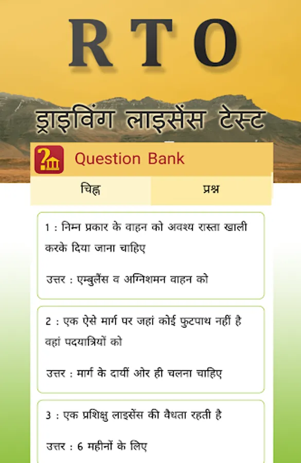 All RTO Office conduct theory exam of driving license on computer base.It is also useful for Learning License of Light Motor Vehicle (LMV), Heavy Motor Vehicle (HMV).Here we have give two mode Learning and Test mode for you to be aware about RTO exam and remove fear of failing and pass your RTO Driving license Test with full confidence .
