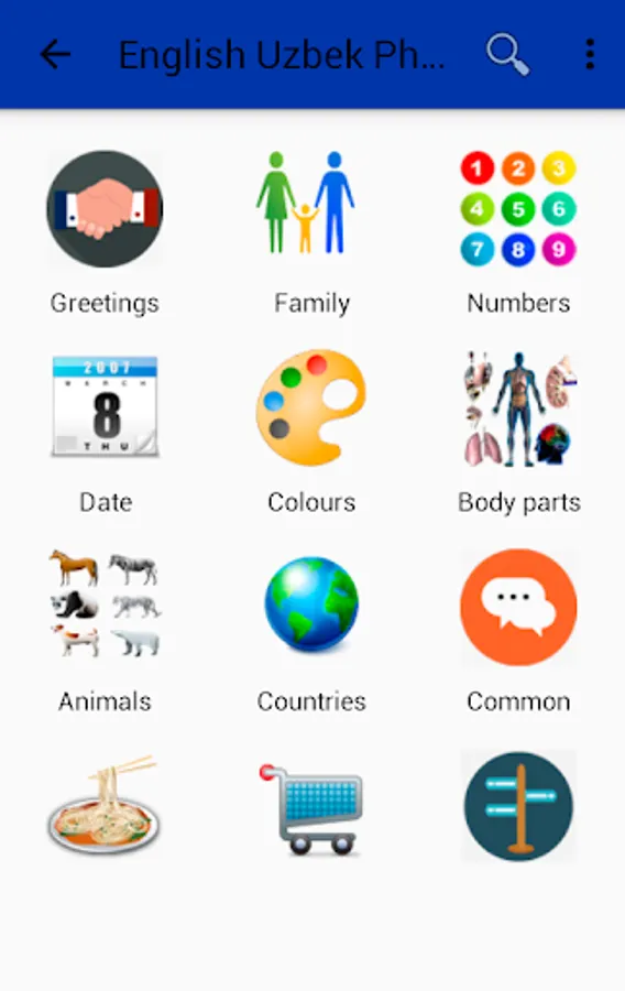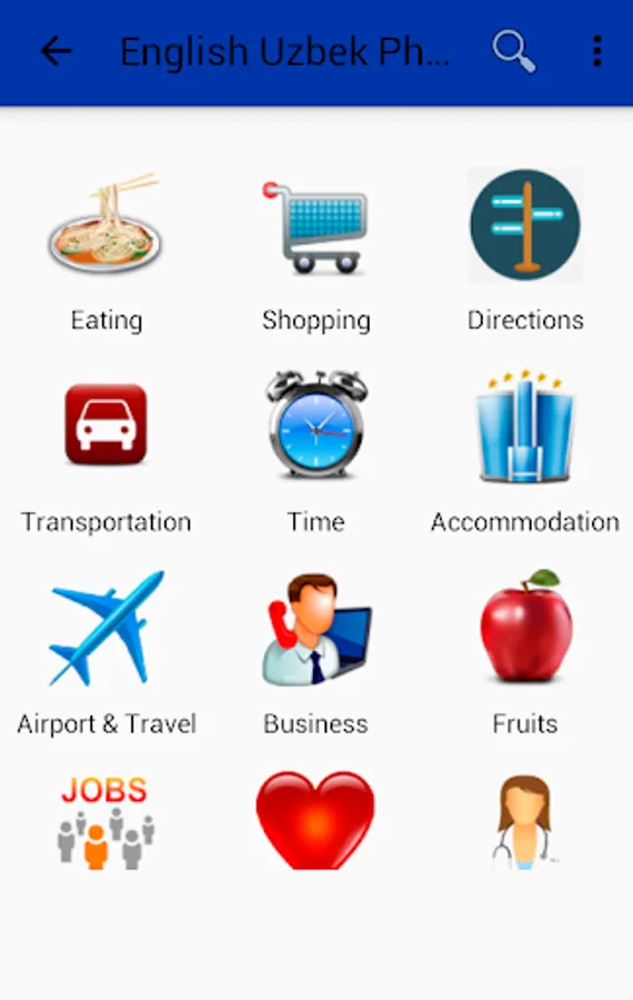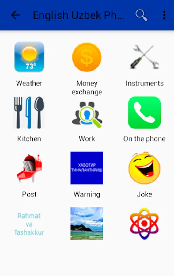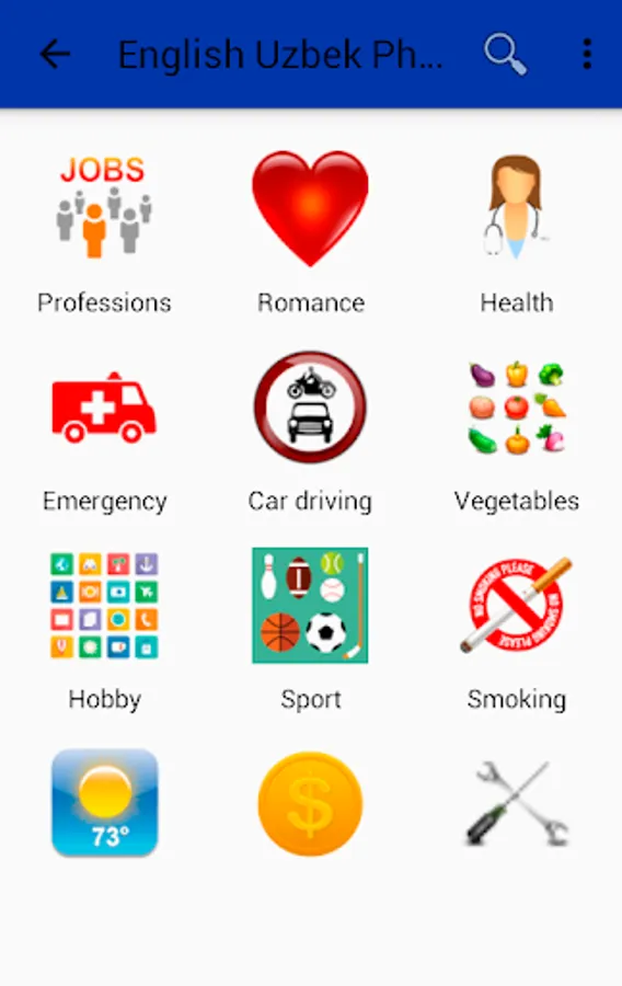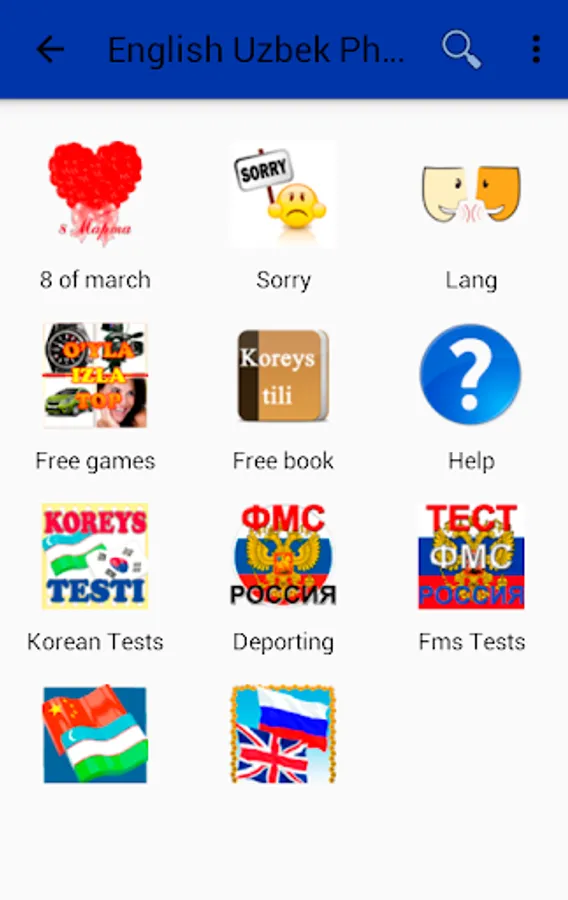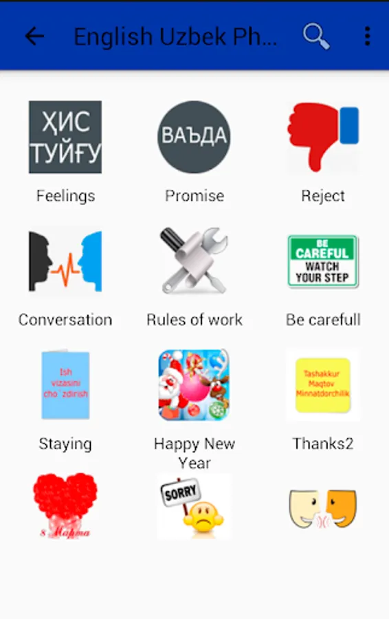 Phrasebook is intended for those who are going to study or travel. The phrasebook hasn't been translated by professionals. For it's translation was not involved professional translators and teachers. We are with our initiatives launched this application for those who want to learn the Uzbek language. We hope that you like the application, and will be useful to you.