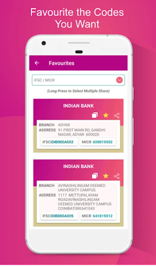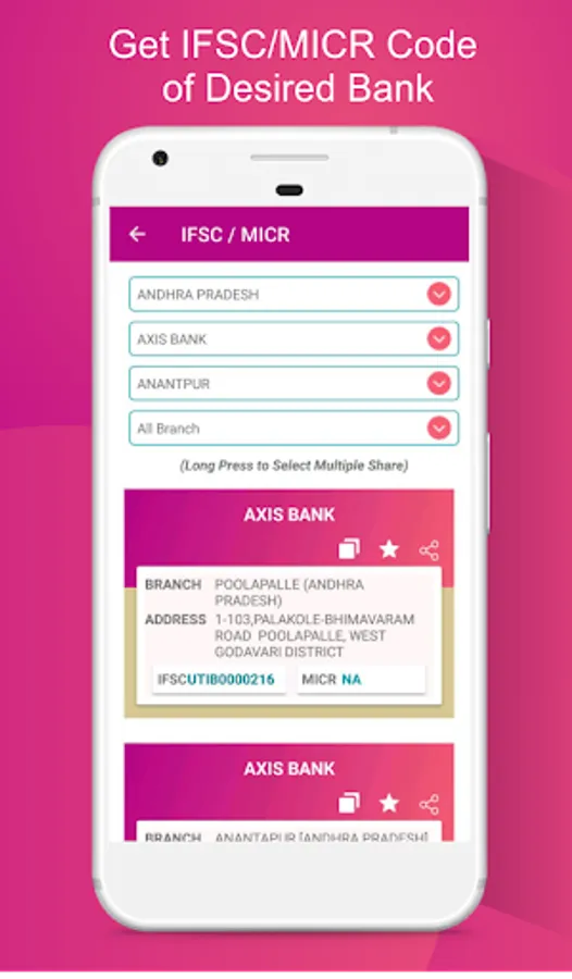 • You can easily search for IFSC/MICR codes of any bank branches with State, Bank Name, District and City in this bank ifsc and micr code app.