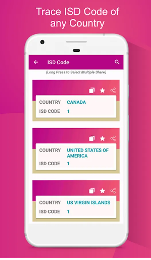 • Simple search with a country name in this ISD code finder app, directly gives you the ISD code of the desired country.