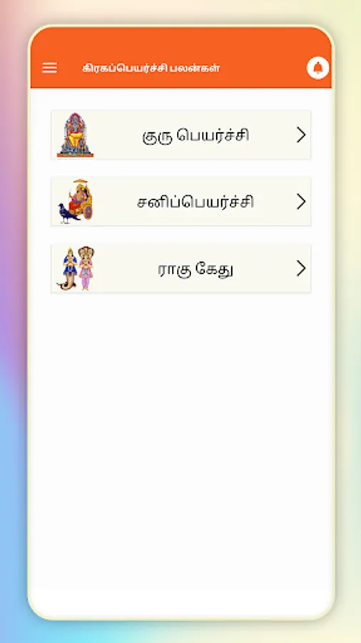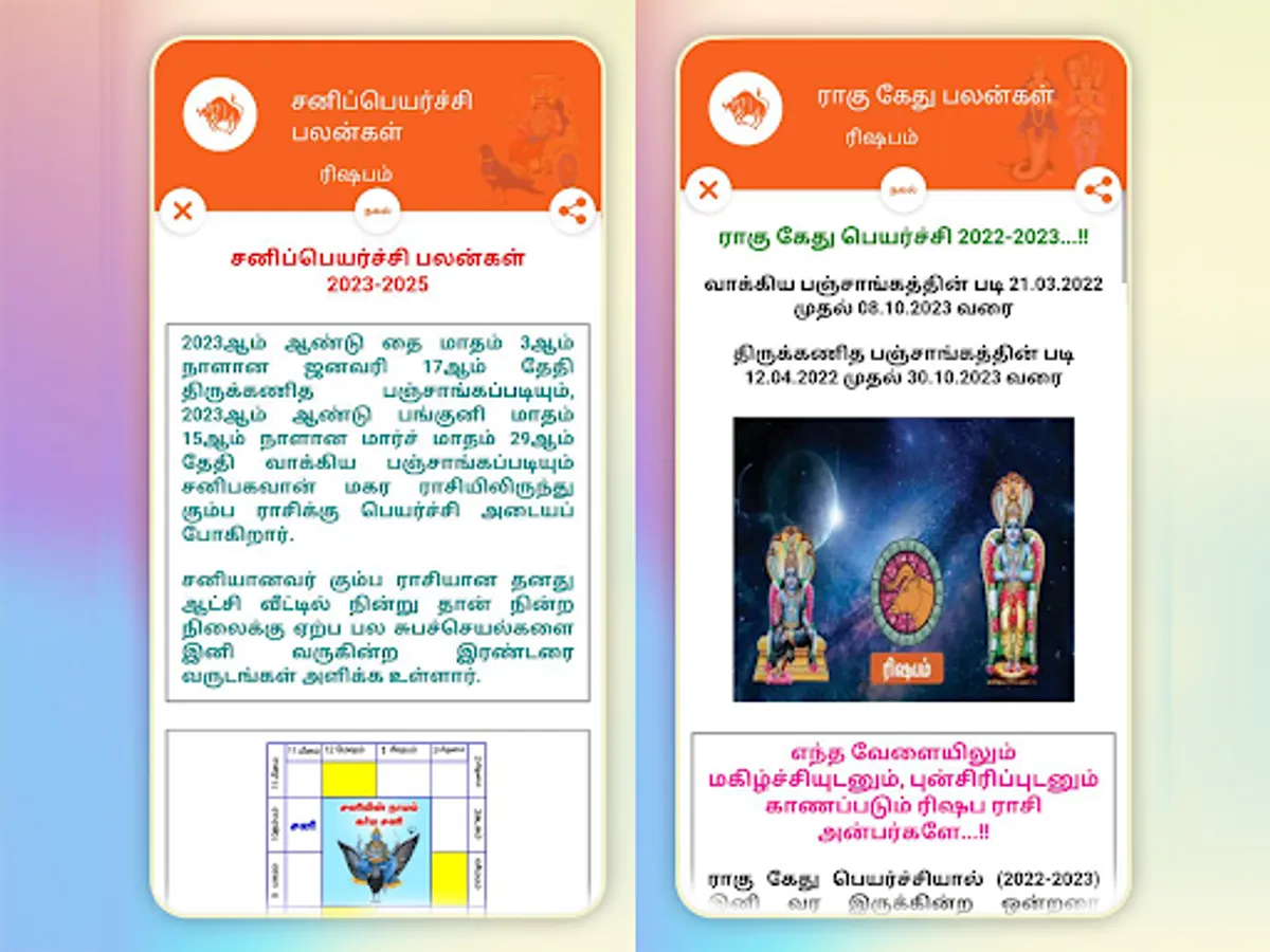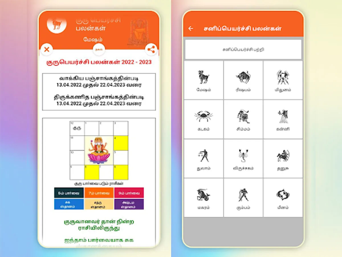 Grahapeyarchi palangal app – free tamil astrological app to know all graha benefits such as guru peyarchi palangal (Jupiter Transit), Sani peyarchi palangal (Saturn transit), Raku Kethu peyarchi palangal etc for all 12 zodiacs such as mesham, rishabam, mithunam, kadagam, magaram, kumbam, kanni, simmam, thulam, dhanusu, viruchigam and meenam.