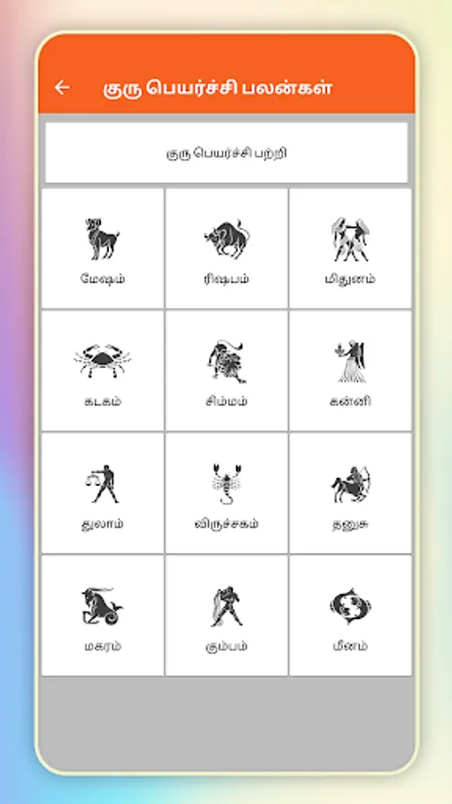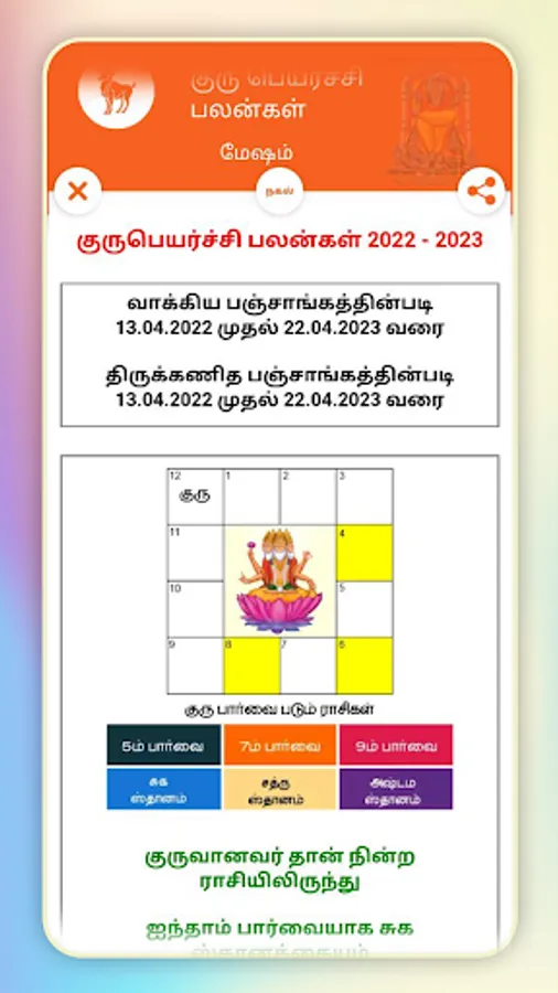 This Guru transit 2023 gives a prediction for 12 signs Aries, Taurus, Gemini, Cancer, Leo, Virgo, Libra, Scorpio, Sagittarius, Capricorn, Aquarius and Pisces. This app gives guru peyarchi palankal for the year 2023 and also pariharangal for all rasi’s.