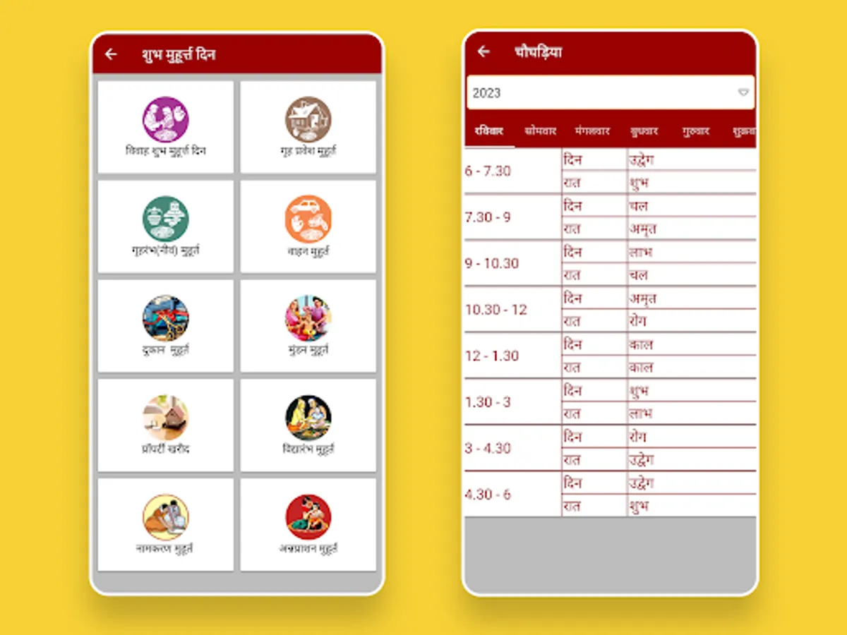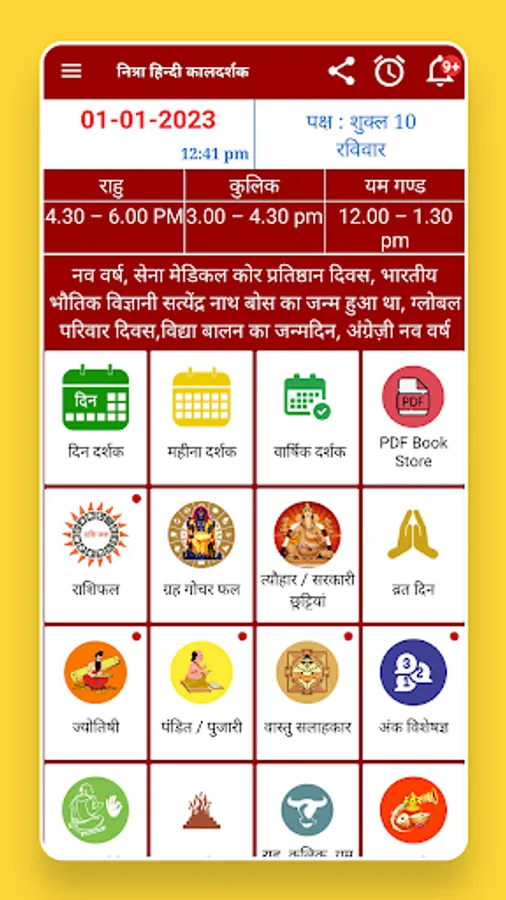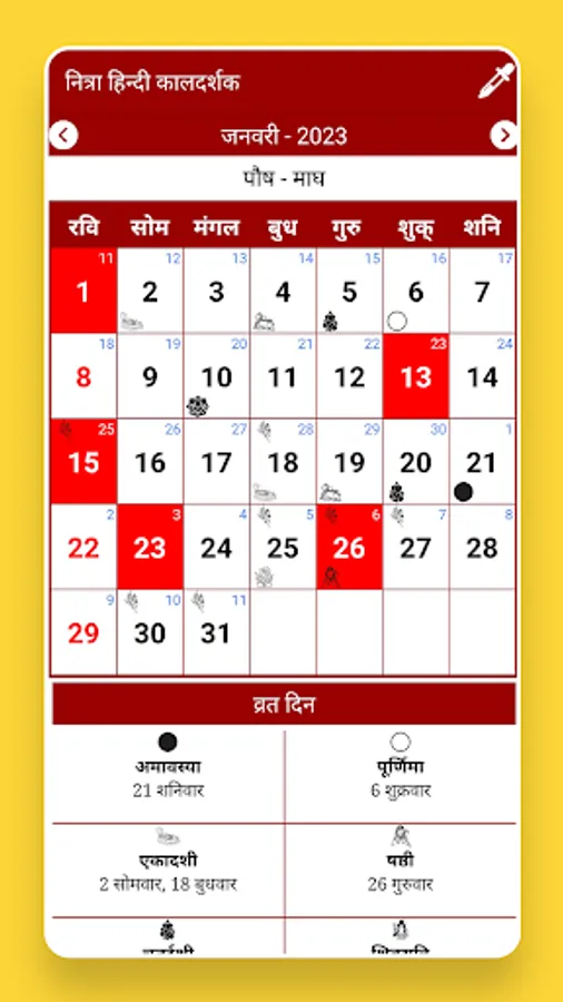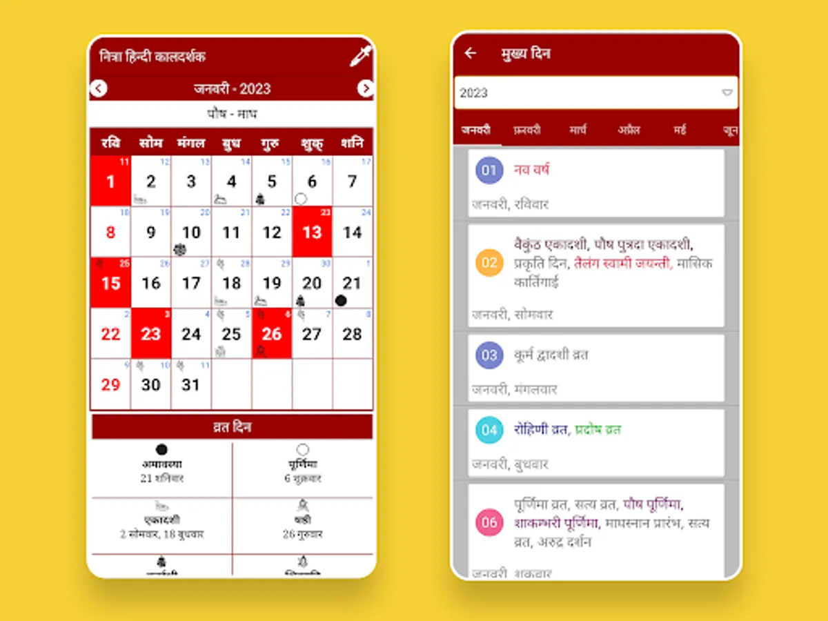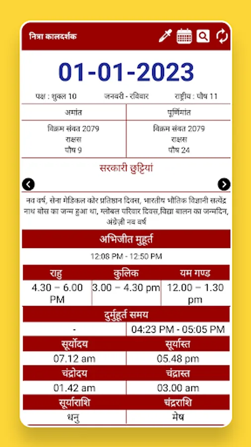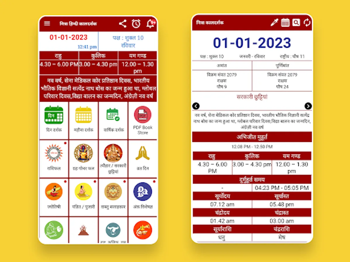 Hindi Calendar with 2023 Panchang offline app has the complete information like Holidays, Festival list, Subha Muhurat, fasting days.