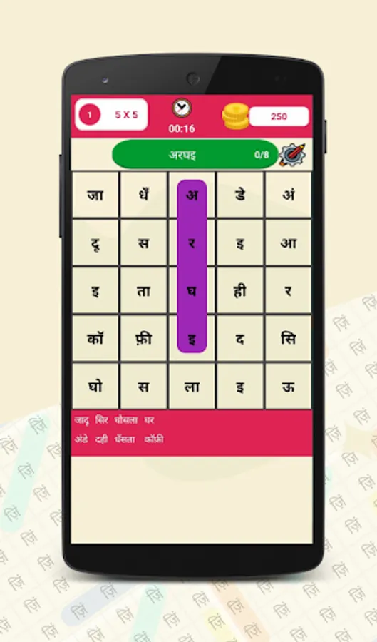 The Hindi Word Search game allows you to search the Hindi words through board based on text splitting and jumbled letters.