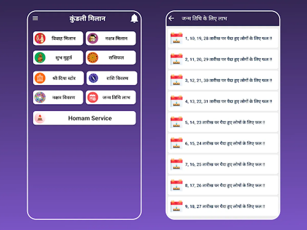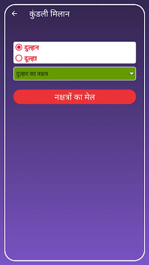 This absolutely free app kundali match / kundali milan in hindi language gives the marriage match information based on 8 matching method which is followed by north Indian astrology.