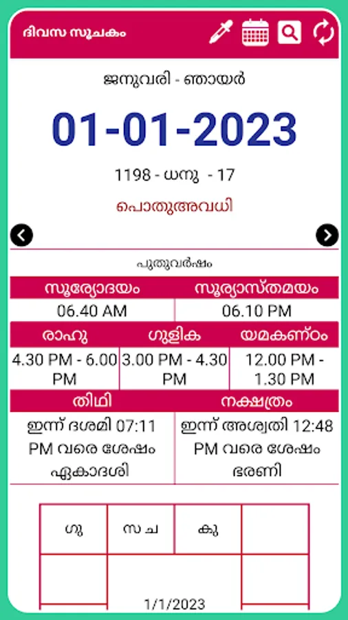 Malayalam panchangam 2023 allows you to view Malayalam year, Malayalam month, Kalam, Sooryodayam, Sooryaasthamam for all days in year 2023 in offline mode.