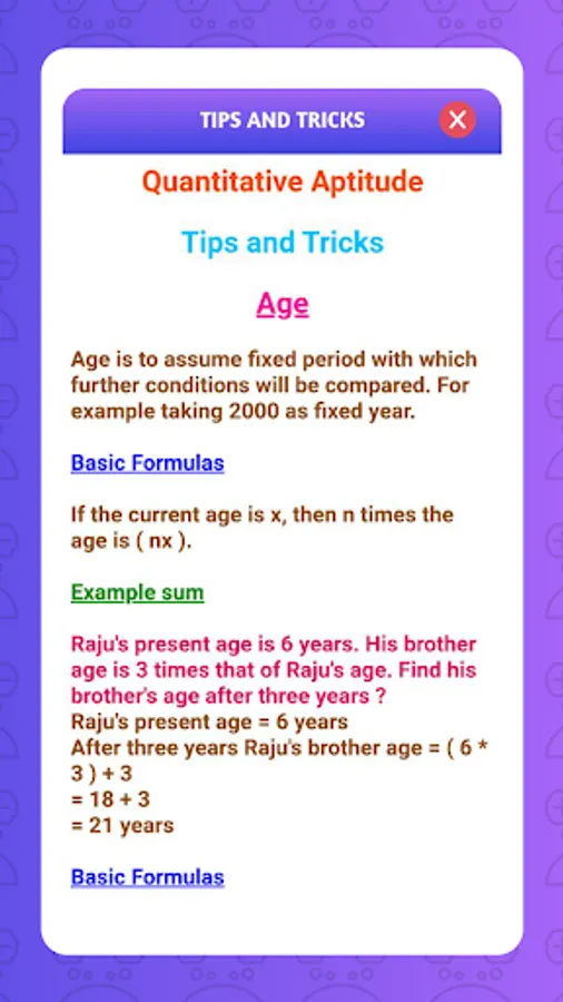 Not only that even you can also learn basics of mathematics, formulas and all tricks, aptitude and reasoning tricks to solve efficiently using this app.