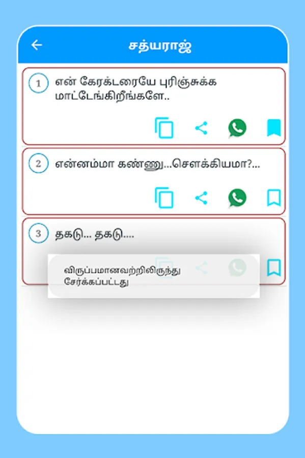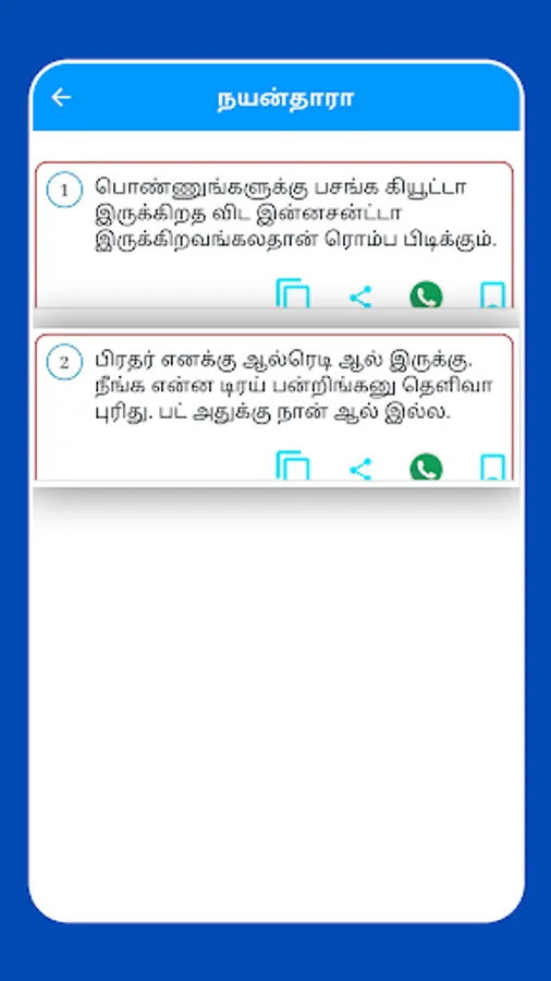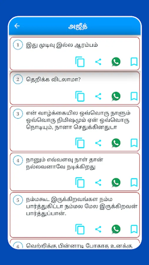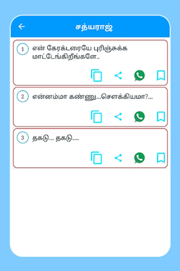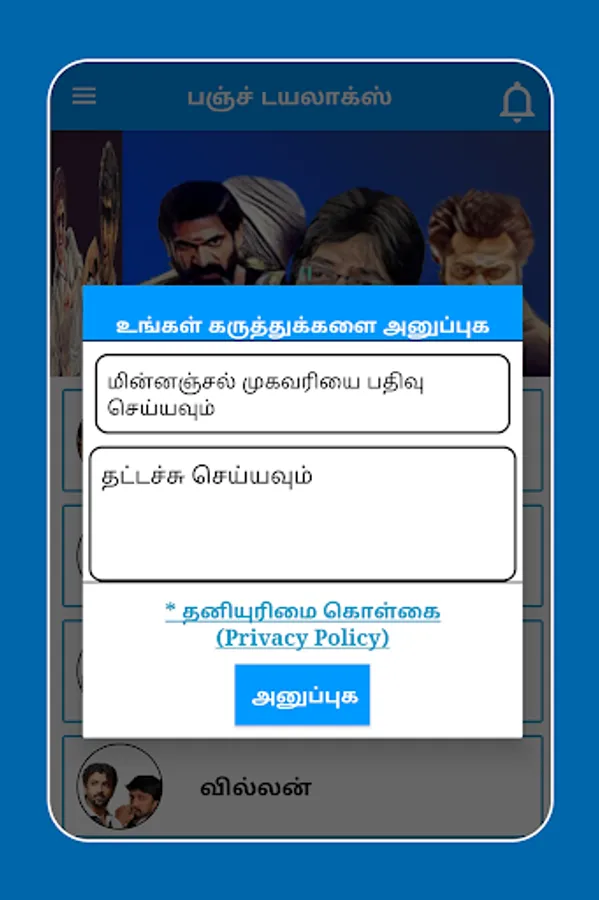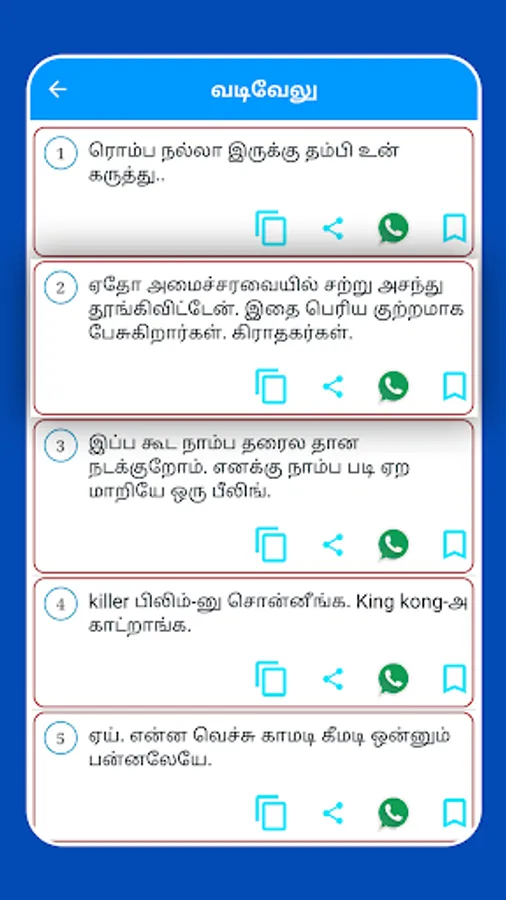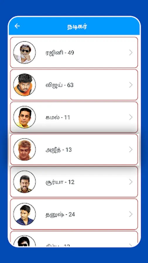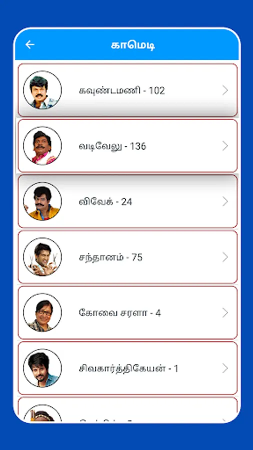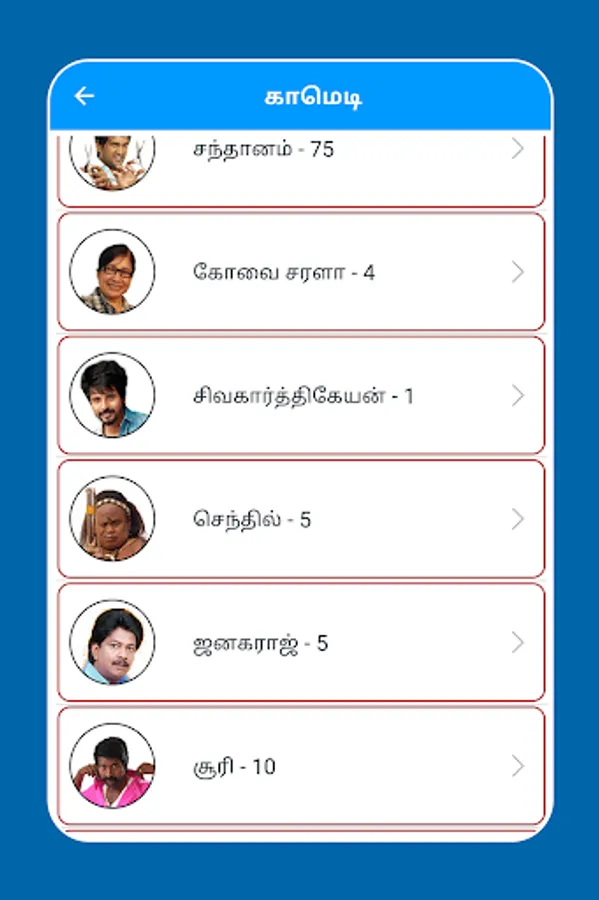 Our Cinema Punch dialogues app has tamil punches of 18 actors, 3 actress, 10 comedians and other Tamil movie Punch Dialogues by various actors and actresses.