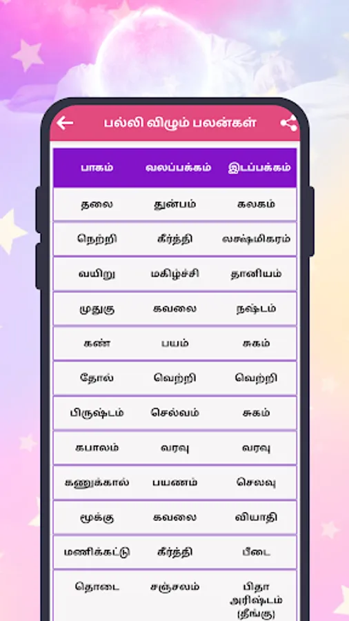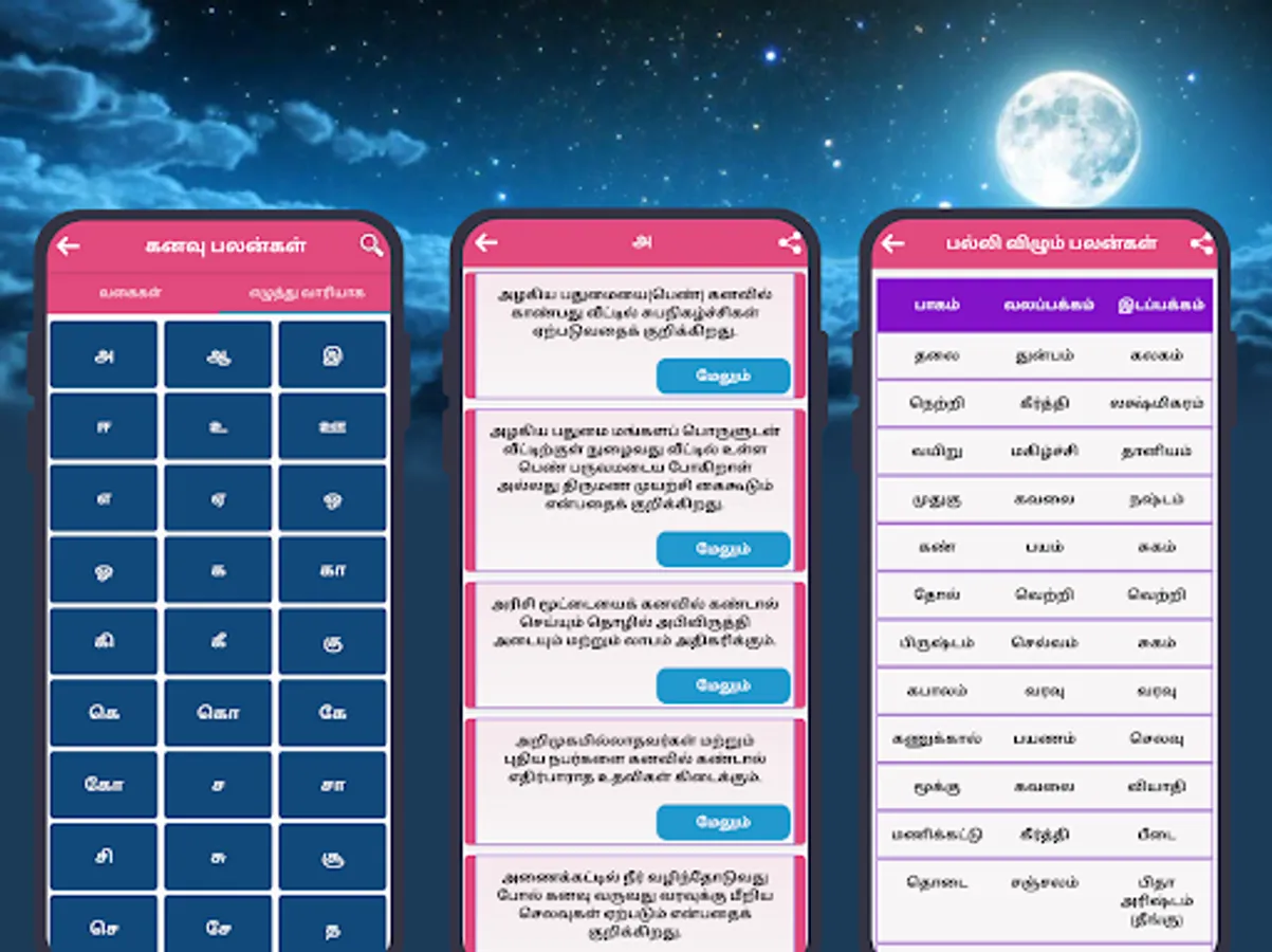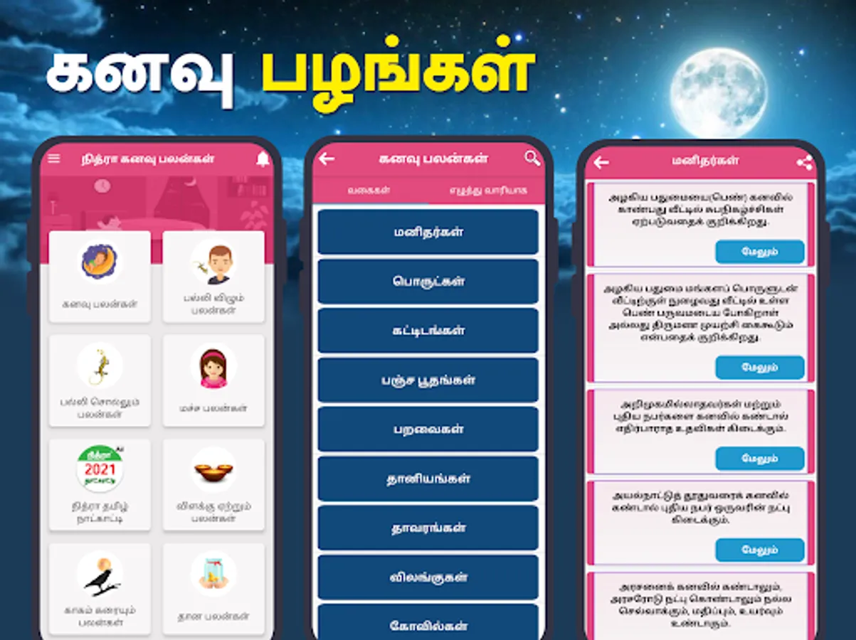 Also, this Dream Moods Dream Dictionary app consist of Palli Vilum palangal, Palli sollum Palanagal, Macha Palangal, Vilaku Yetrum palangal, Kakagam Karaium Palangal, Dhaana Palangal and Manaiyadi Sastra Palangal.