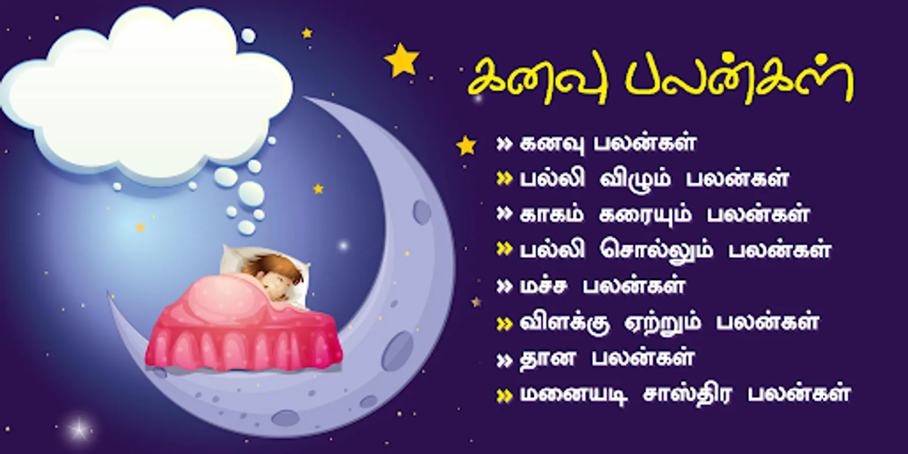 This Dream dictionary/Dream Book app consists of 10 different categories with 400+ dream meanings in Tamil are