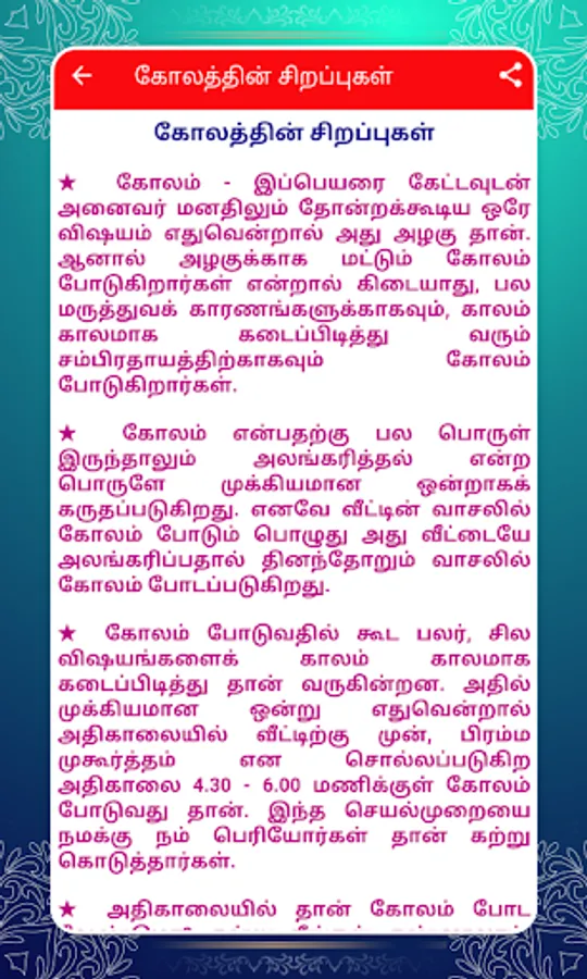 Download this " kolangal " app to make your festival colorful with these beautiful " rangoli kolam ". Share with your friends.