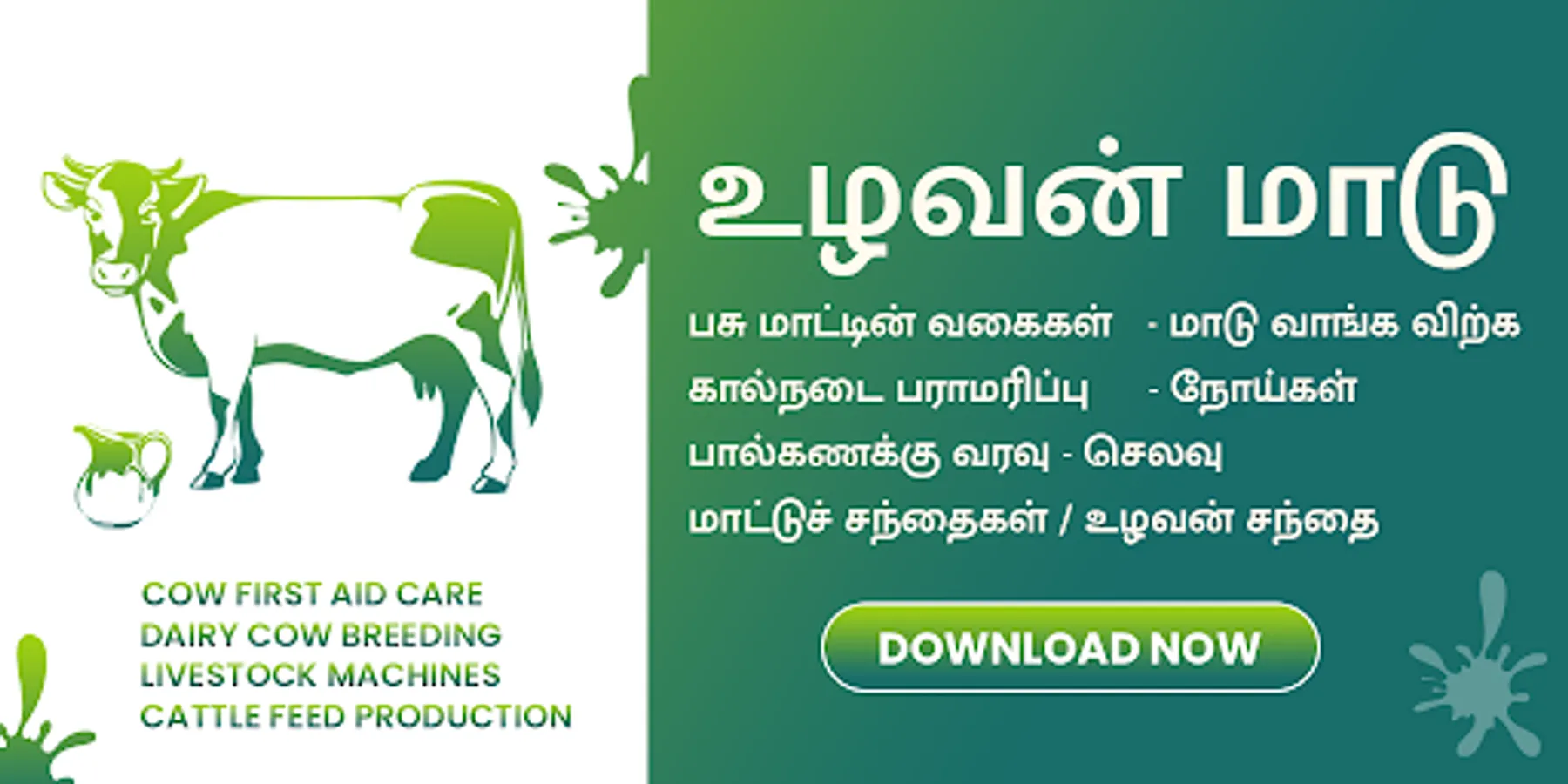 Cow Breeding (உழவன் மாடு / நித்ரா மாடு வளர்ப்பு) - This free cattle farming app guides the people who have cow farm or want to set up cattle farm. This livestock farming app is completely free and especially useful for the people across Tamilnadu.