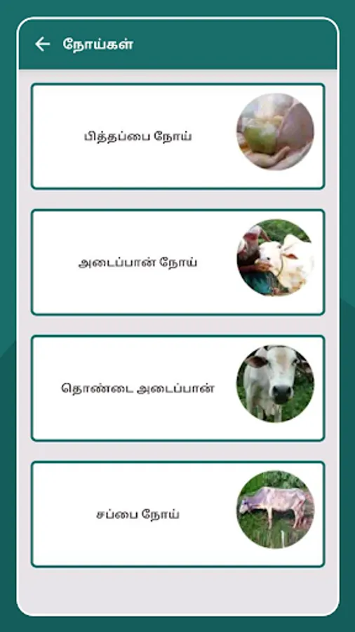 Cow Types (பசு மாட்டின் வகைகள்) - In this Tamil Cattle Expert System app, this Cow Types category consist of two types cows such as Native Cows and Foreign Cattle. Also, it consists of details of Dairy cows like Jersey, Holstin piriciyan, Kir cows, Sahiwal, Sindhi, Kangayam, Hillary, Bargur, Umpalacceri, Pulikulam / Alamadi, Haryana, Kangrej, Ongole, Krishna Valley, Tiyoni, etc