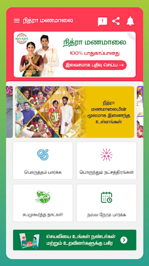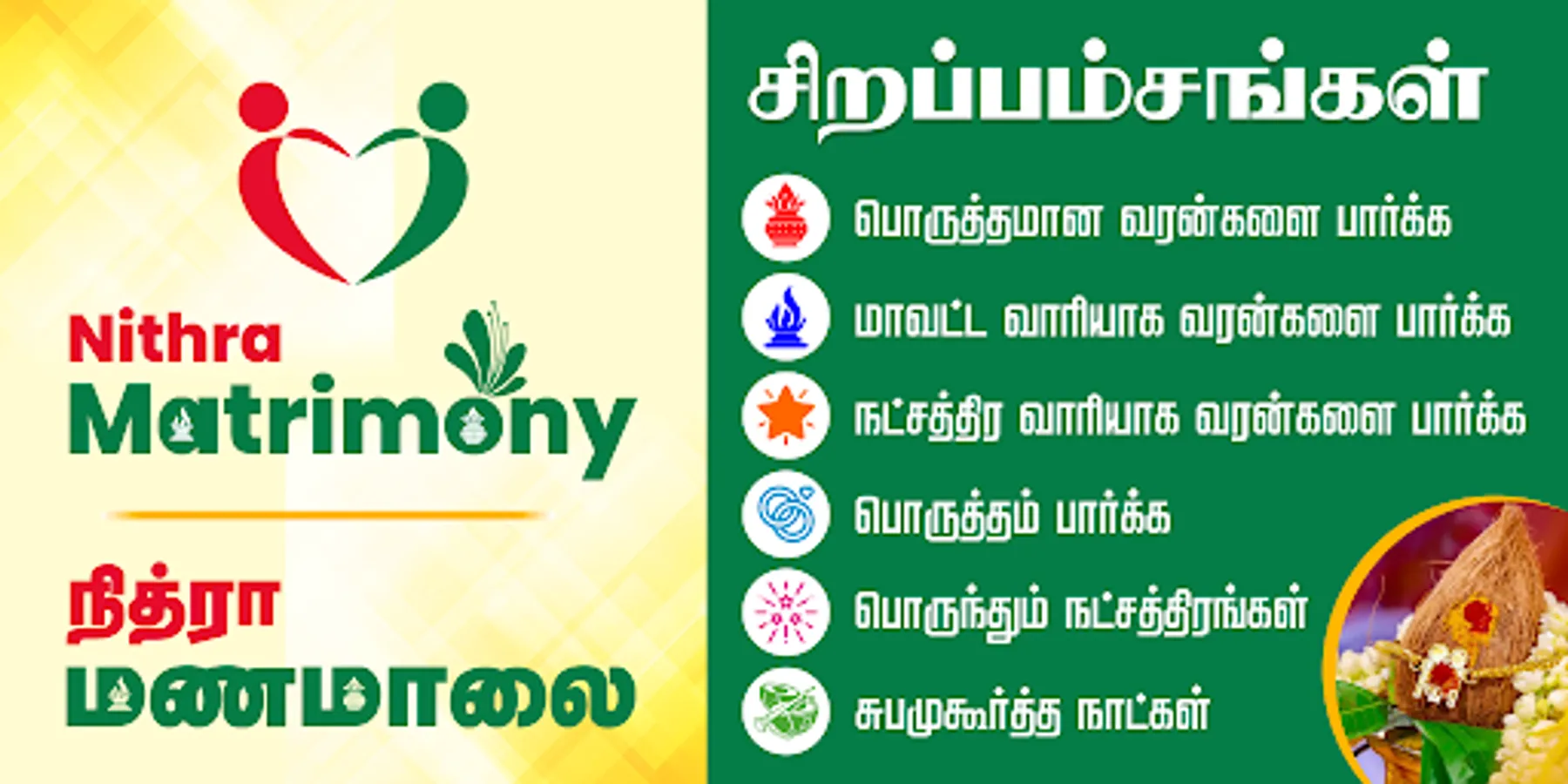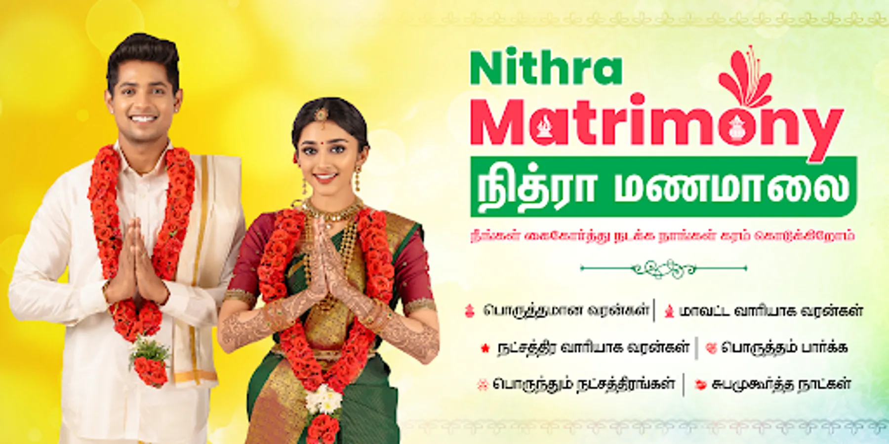 Nithra Matrimony 2023 - marriage matching app(நித்ரா மணமாலை மற்றும் திருமண பொருத்தம்) includes Nithra Manamaalai, porutham parka, subamuhurtha natkal, porunthum nachathirangal and nalla neram parka.