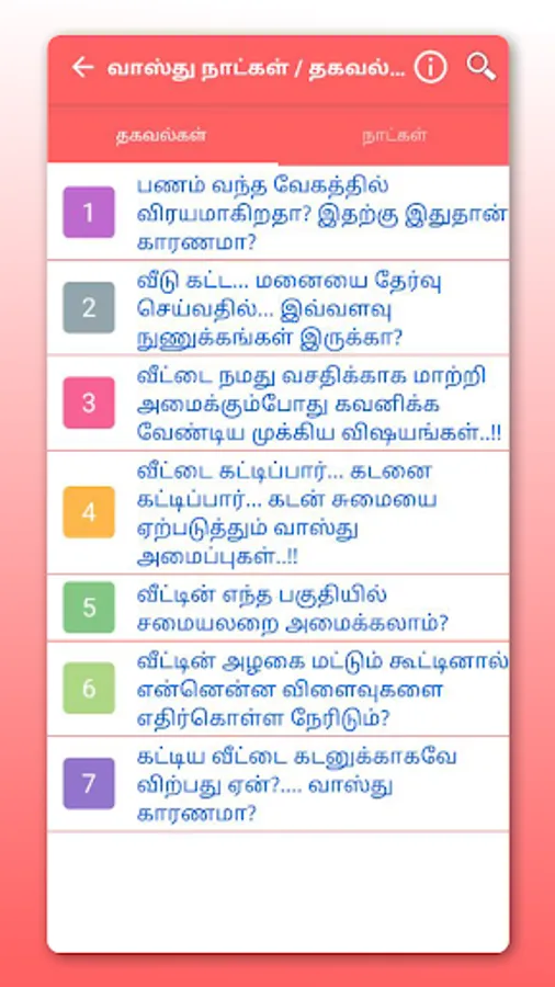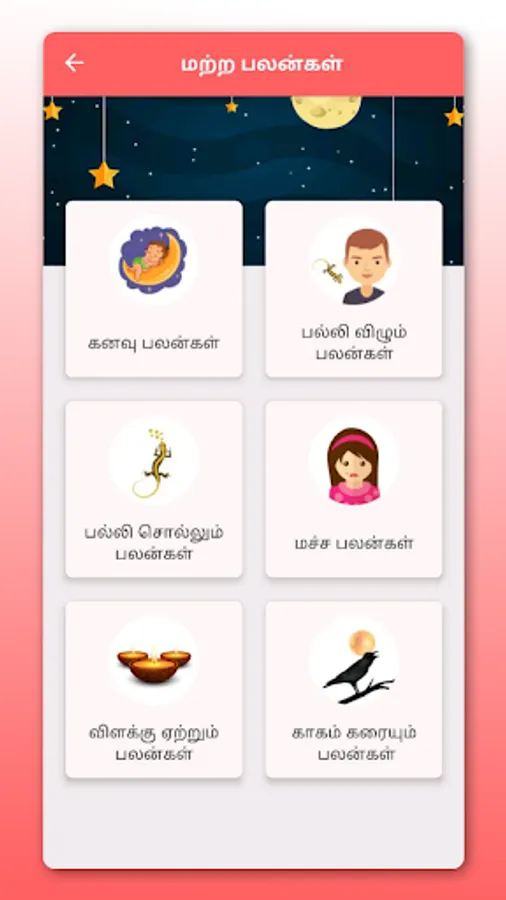 💫 You can also get details of brief details about rasi and stars, natchathira palangal, thara palangal, online pages (details about road rules, samayal tips, IFSC code, proverbs, Tamil stories, Tamilnadu tours, details about Tamilnadu temples, beauty tips, jokes, Tamil riddles, self employment, leaders history and petrol, diesel price), pirantha naal palangal, kanavu palankal, palli vizhum palan, palli sollum palan, macha palangal, lighting lamp palangal, kaagam karaiyum palan, dhaana palankal, manaiyadi sashthiram, thummal sagunam), parigaram, audio/video, vastu days with vastu naatkal are available in this tamil rasipalan app.