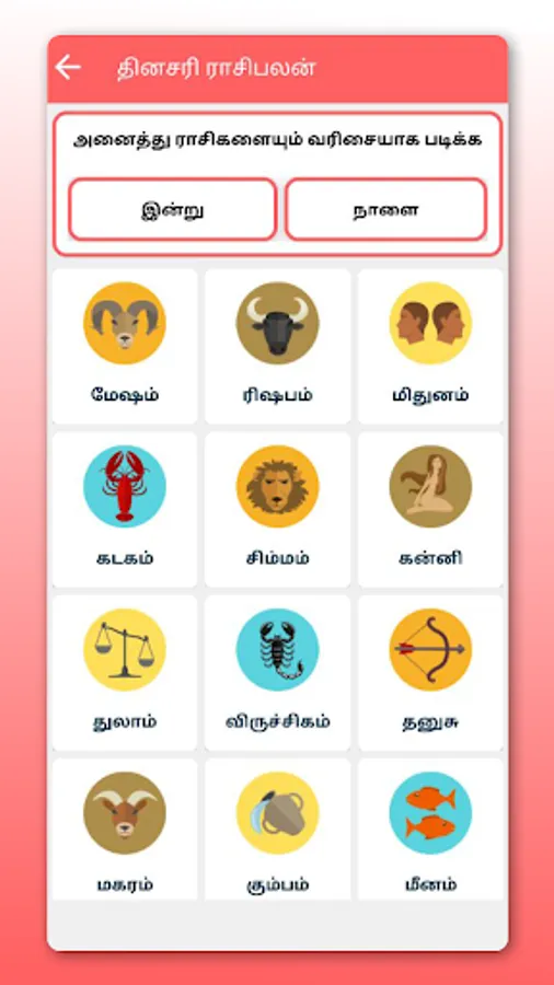 💫 Nithra 'Rasi palangal 2023' app - completely free app that provides accurate benefits for all zodiac signs i.e., Tamil horoscopes by astrologer of real time. In this Daily Tamil Rasipalankal 2023 is based on the principles of Tamil astrology. This daily rasi palan 2023 benefits of 12 zodiac signs are Aries, Taurus, Gemini, Leo, Cancer, Virgo, Libra, Scorpio, Sagittarius, Capricorn, Aquarius and Pisces horoscope.