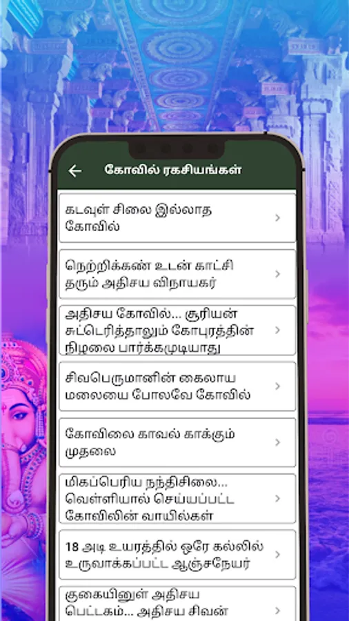 In this Tamil temple ragasiyam app includes spiritual information(Sprituality) history of all the gods and temples.