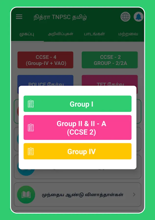 'TNPSC Group IV App' the Expert app for Group Exams like CCSE IV (VAO+Group IV), CCSE II (CCSE II Interview+ CCSE II Non interview) Group 1, Group 2A, Group 4, Group 7, Police Exam, TNUSRB Exam, TET Exam, VAO.