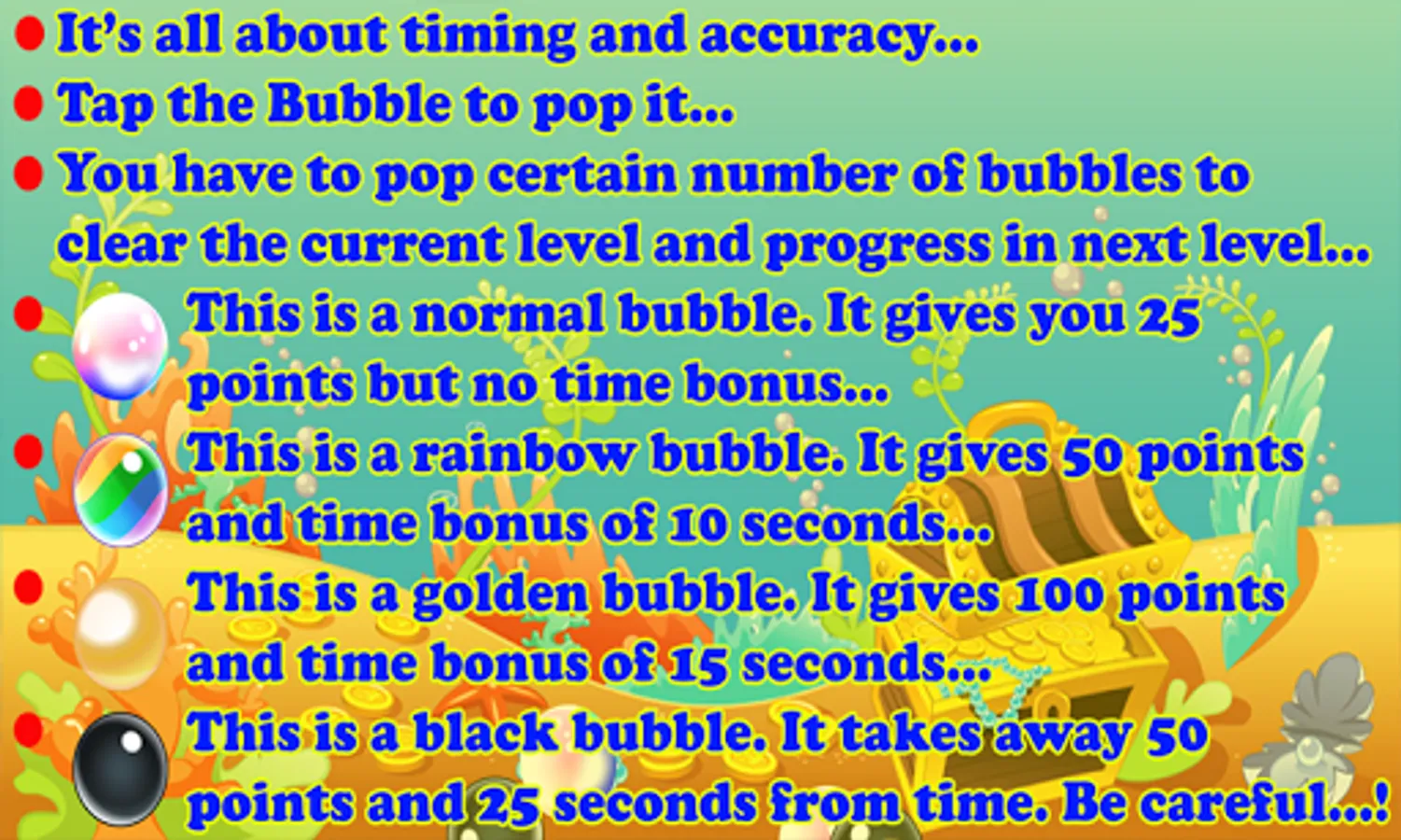 Game task is so easy. You have to pop the bubbles on screen just by touching them. Pop certain amount of bubbles in given time to progress into next level but there are 4 types of bubbles. Only Pink Bubbles helps to progress the level while Gold Bubbles gives bonus score and Rainbow Bubbles gives extra time. Be aware from Black once. They will lose your points.