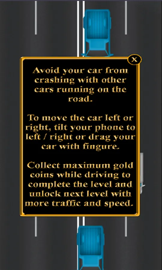 There are five levels in this version and only one level is available to play at beginning. You have to collect certain amount of gold coins to complete one level and unlock next one. Each level brings you more trouble with increased traffic and car speed. You have to score more than previous level to complete this level and unlock next level.