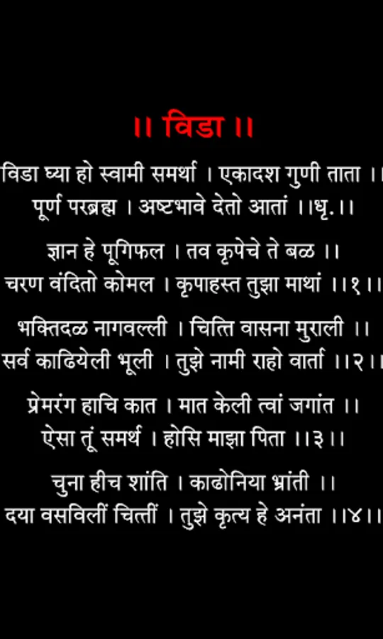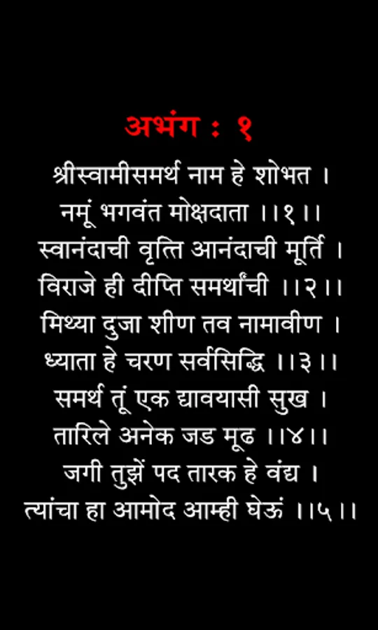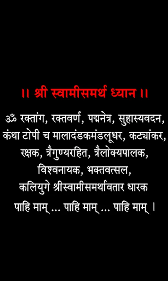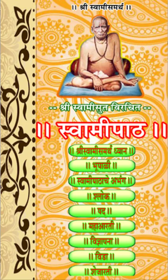 This app is a collection of Shree Swami Samarth Dhyan, Bhupali, Swamipath Abhangas, Pad, Shlok, Maha Aarti, Vidnyapana, Vida and Shejarti. All of them are created by Shree Swamisut Maharaj. We have included some information about Shree Swamisut at the end.